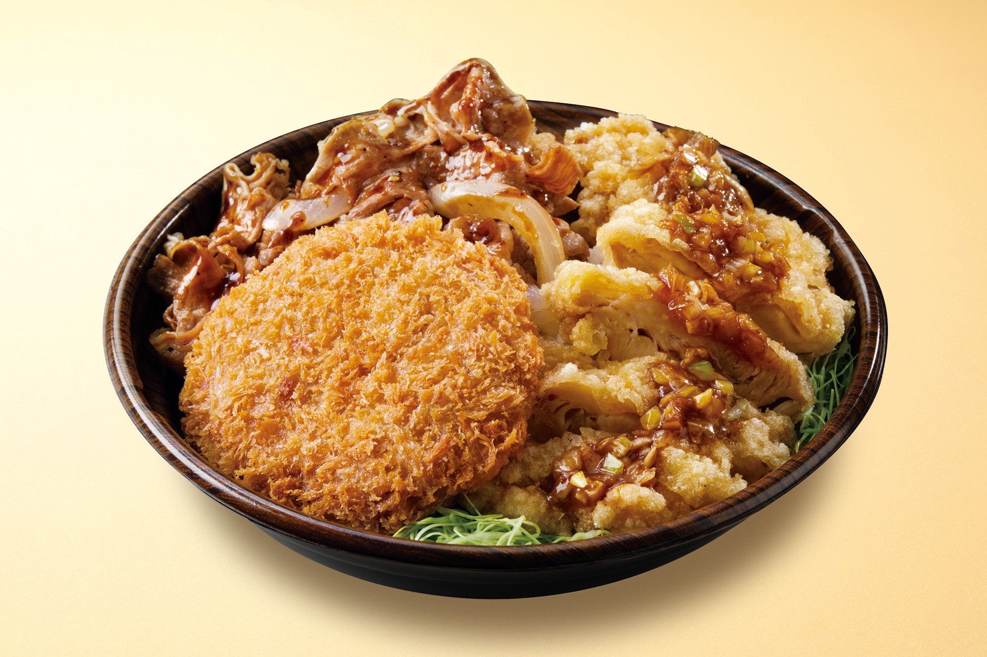 今月の「肉トリプル丼」は、どーんと大きな油淋鶏1枚、牛バラ肉とタマネギを鉄鍋で一気に強火で炒め、旨みを引き立てた牛焼肉1食、キャベツの食感がくせになるキャベツメンチカツ1個に千切りキャベツがのった丼です。