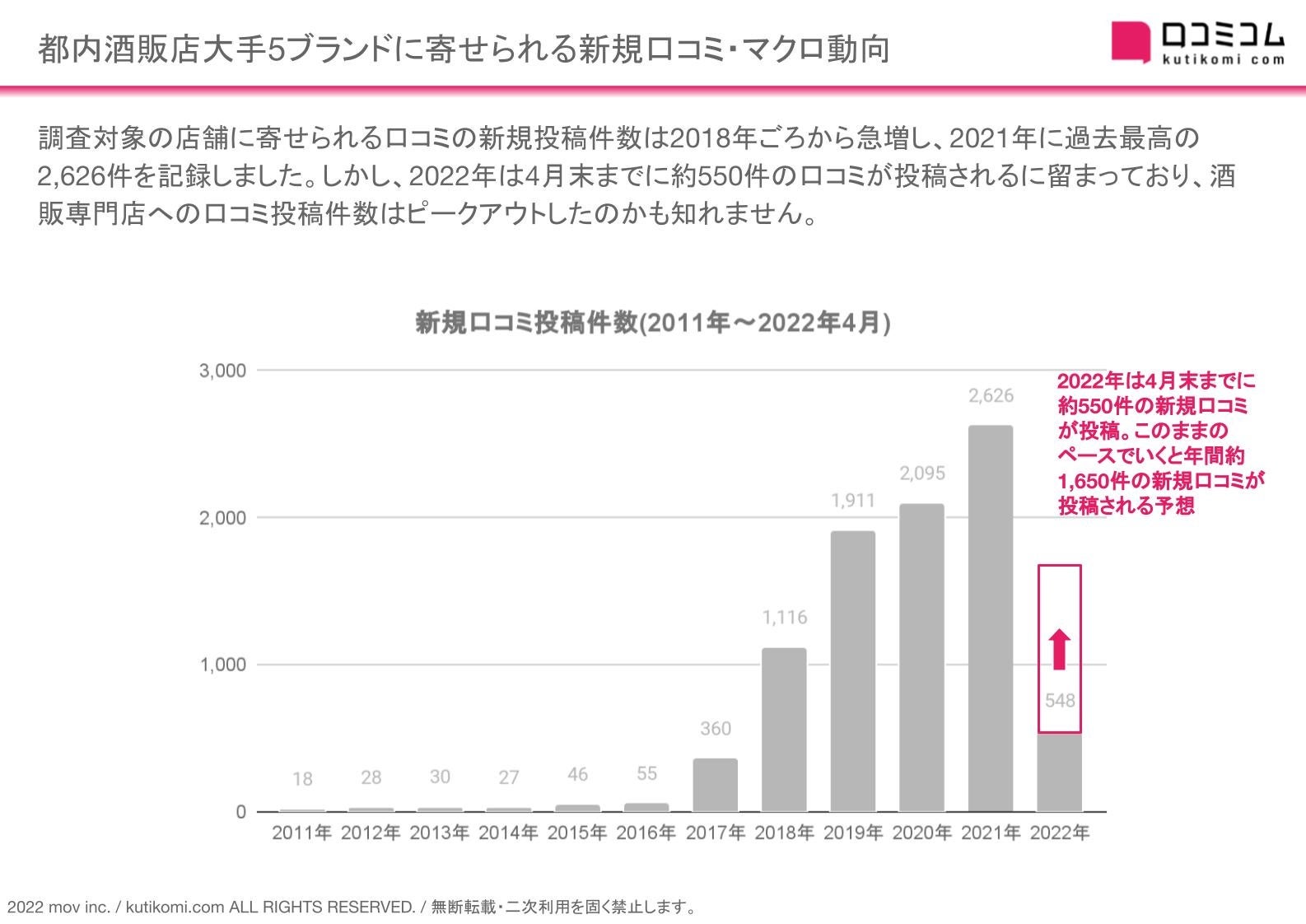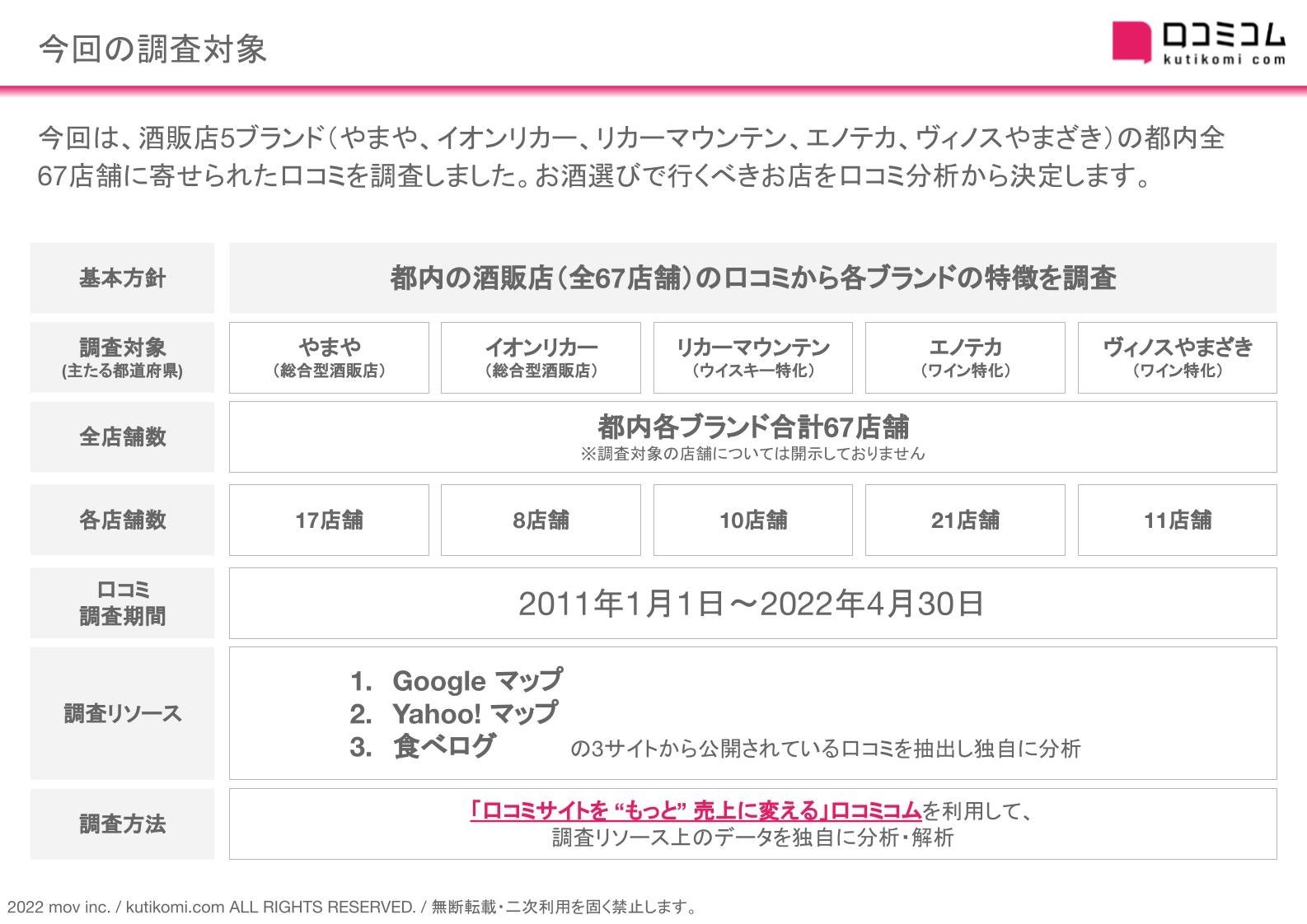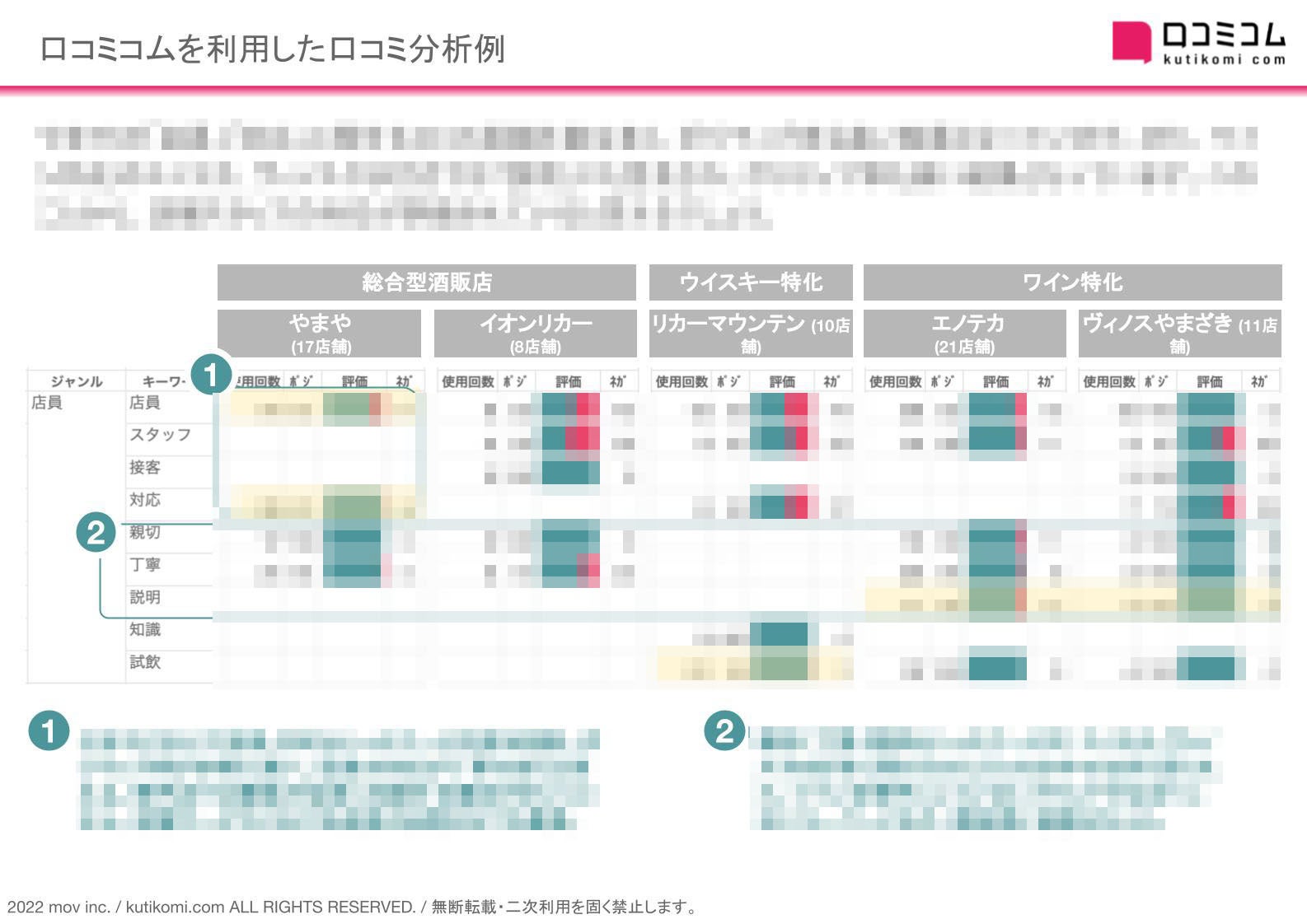 口コミサイトを”もっと”売上に変える『口コミコム』を運営する株式会社mov(代表取締役:渡邊 誠、本社:東京都渋谷区、以下mov)は、『口コミコム』独自のAI分析機能を用い、都内・大手酒販店全67店舗に寄せられた9,000件の口コミを分析してレポートを作成しました。