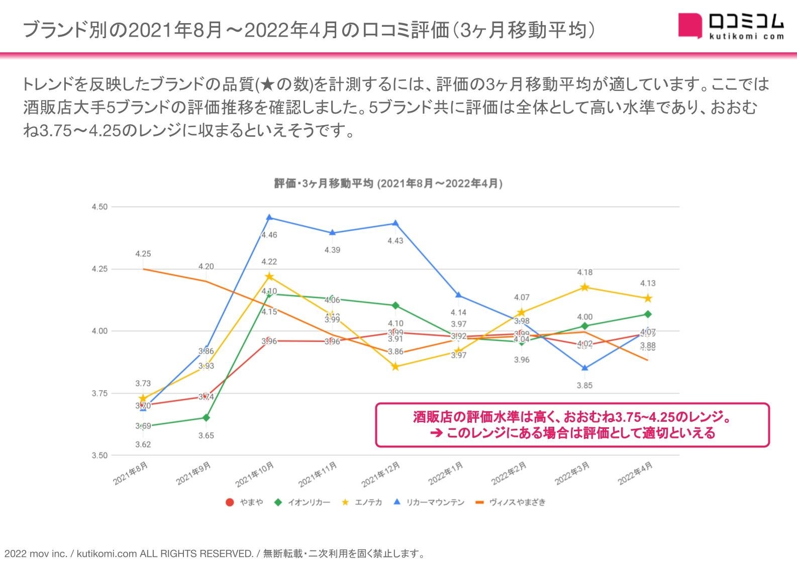 トレンドを反映したブランドの品質(★の数)を計測するには、評価の3ヶ月移動平均が適しています。今回の5ブランドの評価の3ヶ月移動平均から酒販店の評価水準は高く、おおむね3.75~4.25のレンジに落ち着き、このレンジにある場合は評価として適切と言えます。
