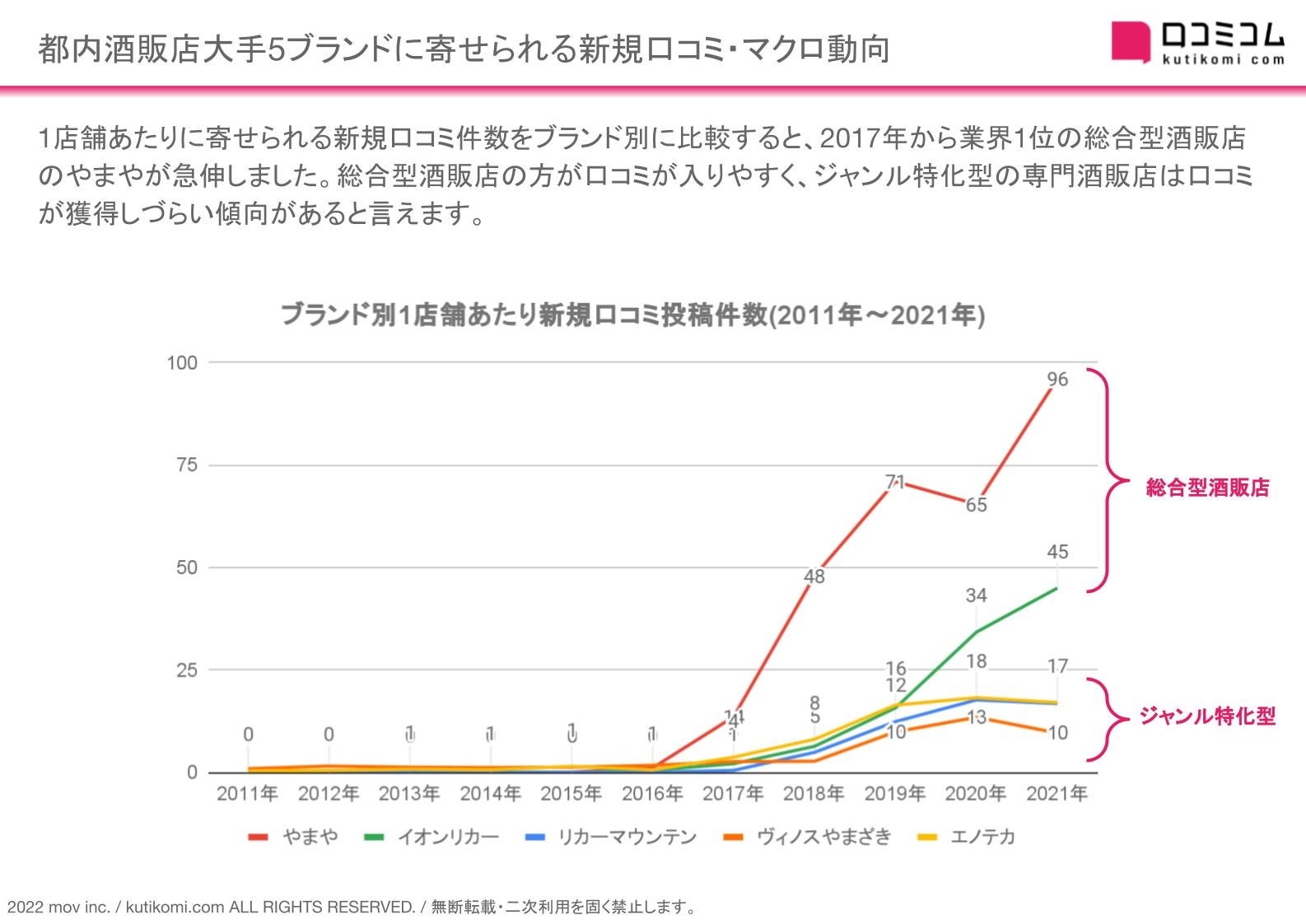 1店舗当たりに寄せられる新規口コミ件数をブランド別に比較すると、2017年から業界1位の総合型酒販店のやまやが急伸しました。総合型酒販店の方が口コミが入りやすく、ジャンル特化型の酒販専門店は口コミが獲得しづらい傾向があると言えます。