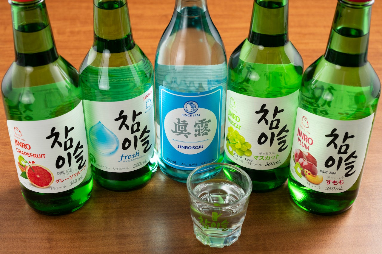 韓国で人気の焼酎チャミスルも豊富にラインナップ。スタンダードのほか、マスカット、すもも、グレープフルーツ、眞露is backをご用意しています。