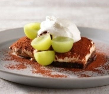 ティラミスとマスカルポーネクリームのなめらかな食感と、シャインマスカットの果実味あふれる食感を同時にお楽しみいただけます。
