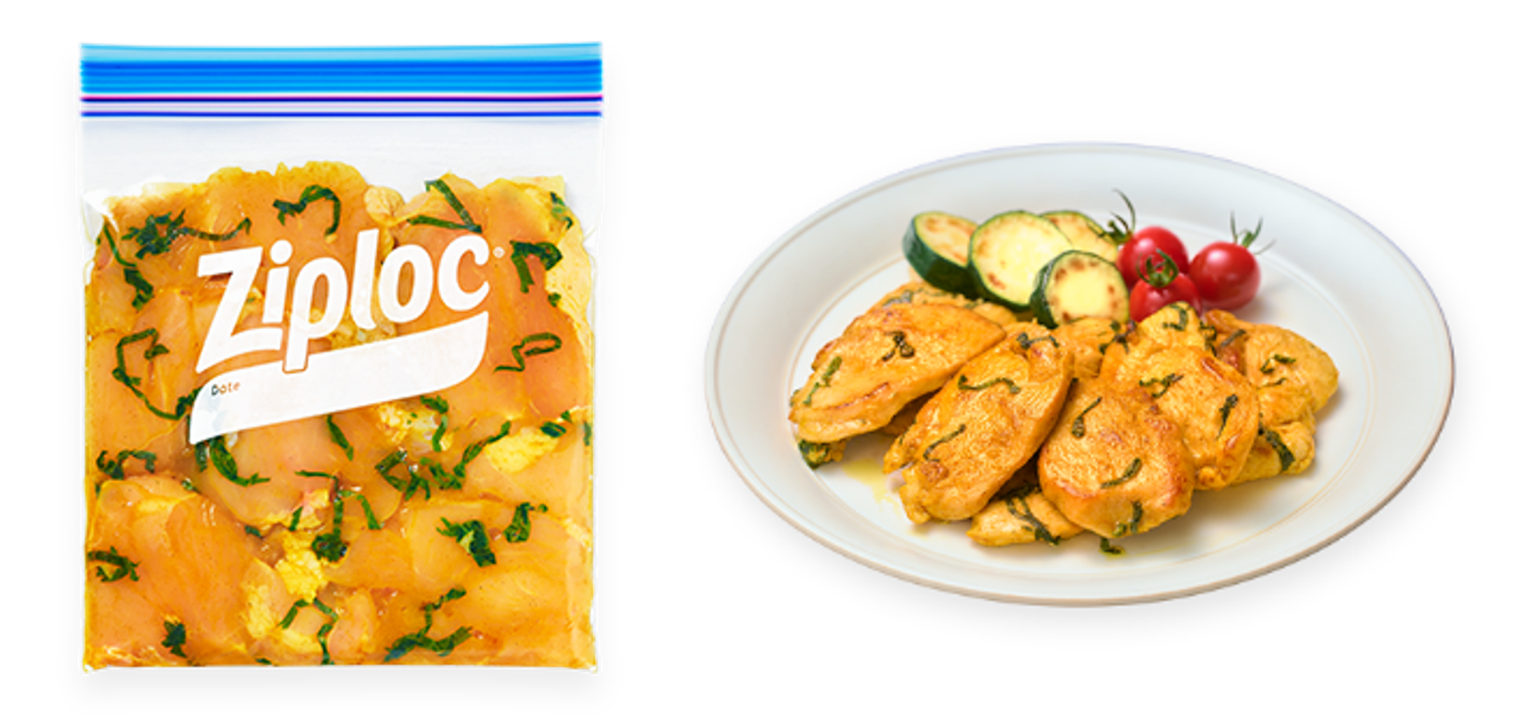 (1)鶏肉は繊維を断つように1cm厚さのそぎ切りにし、「ジップロック®フリーザーバッグ(Ⅿ)」に入れ、