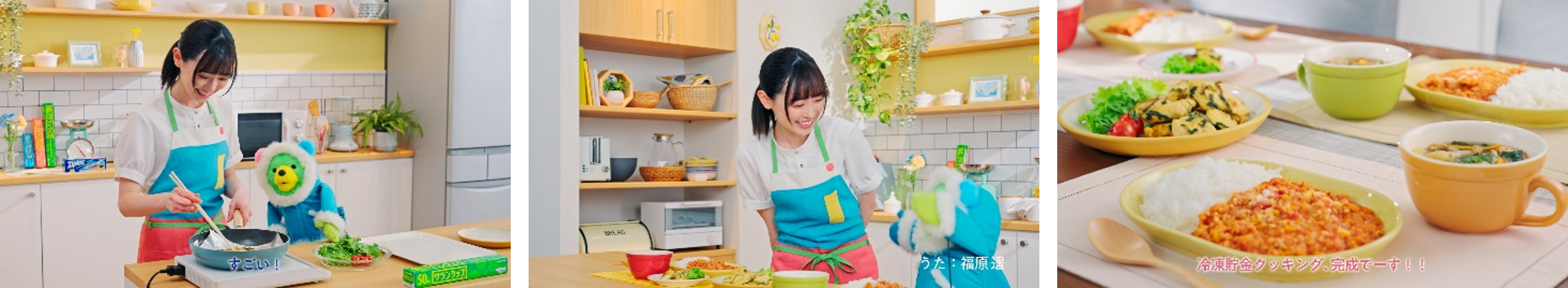 夏休みは子どもの昼食の用意が必要となり、毎日朝昼晩の3食を作ることで、普段よりママ・パパの調理の負担が増えてしまいます。 WEBムービーでは、そんなママ・パパのごはん悩みに役立つ「冷凍貯金」を活用した時短レシピに、「冷凍貯金ラボ」アンバサダーの福原遥さんと、公式キャラクターの「れいちょクマ」が、天の声の進行のもと挑戦。サランラップ®とジップロック®を使って、あっという間に 「レンジにおまかせ彩りスープ」、「かけるだけ!速攻ミートソースライス」、「寝ている間に味染みカレーチキン」の3品を調理していきます。福原さんと「れいちょクマ」が、天の声にツッコまれながら、仲良く調理を進めていく様子をお楽しみください。映像内で流れるオープニングソングは、福原さんが担当。「ちょ、ちょ、ちょ~」という軽快なリズムにのって歌う、福原さんの美声にも注目です。