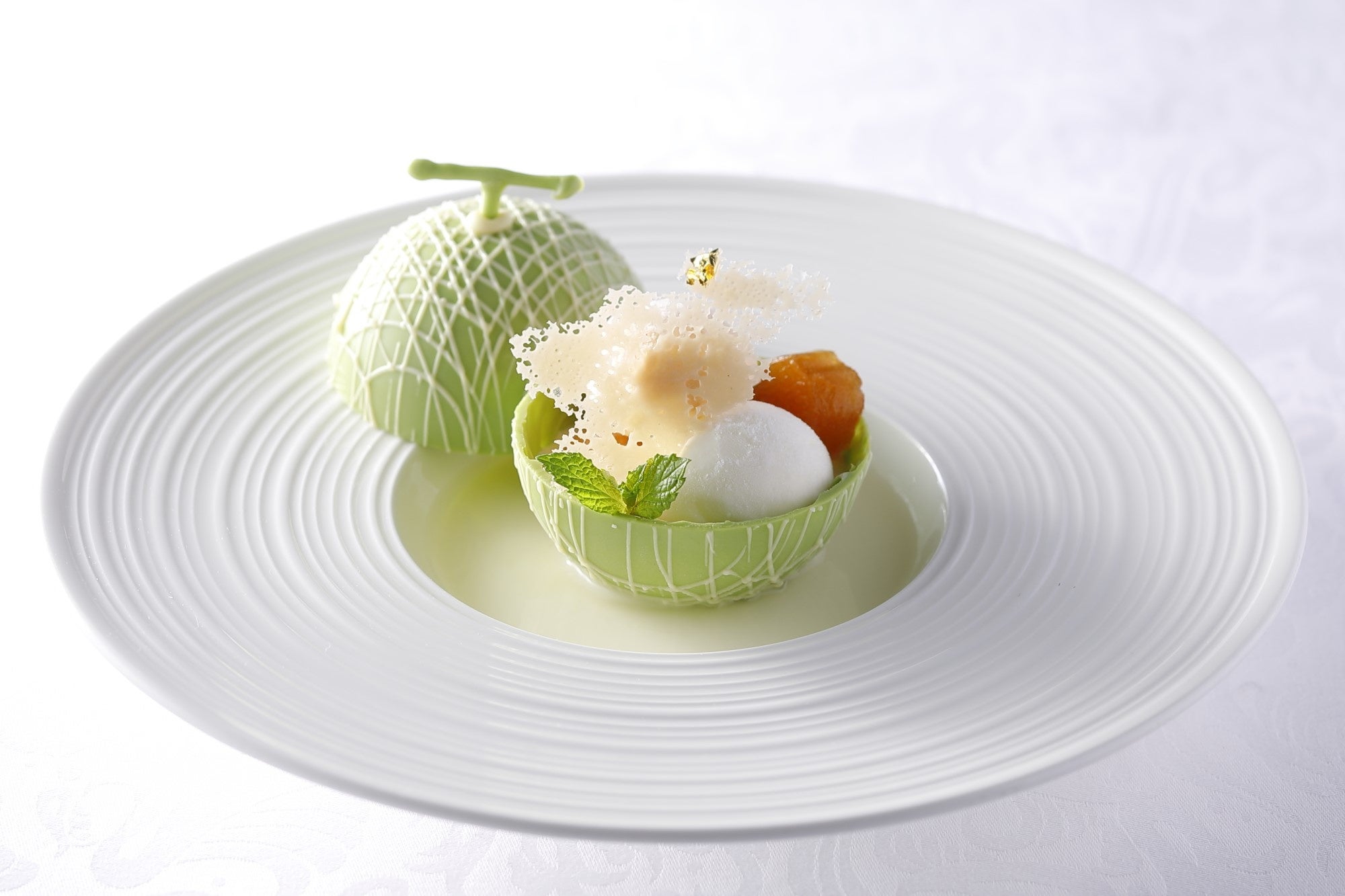 ココナッツ風味のシロップの上にメロンの形のホワイトチョコレートをのせて。中にはゼリーやパート・ド・フリュイ、ソルべ、果肉など様々なスタイルのメロンデザートや爽やかなレモンシャーベットとブランマンジェを組み合わせた一品です。