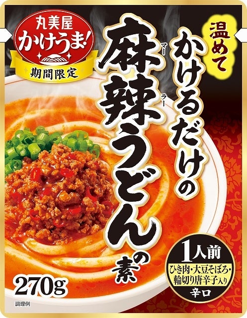 丸美屋食品工業株式会社(本社:東京都杉並区、社長:阿部豊太郎)では、温めて麺にかけるだけの、「1人前 かけうま麺用ソース<麻辣うどんの素>」、「1人前 かけうま麺用ソース<カレーうどんの素>」「1人前 かけうま麺用ソース<担々うどんの素>」を2022年8月25日(木)~2023年3月31日(金)までの期間限定で発売いたします。