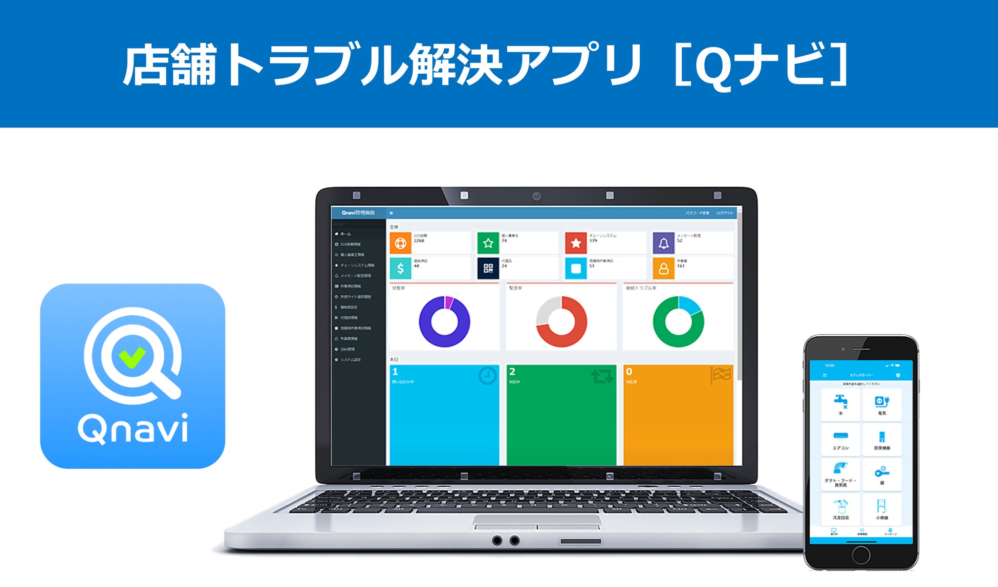 「Qナビ(https://qnavi.club/)」とは、店舗メンテナンス業務のDX化により、店舗の緊急トラブルの対応とその後の手続き等を大幅に簡素化するサービスです。突発的に空調や水回り、漏電等の店舗トラブルが発生した際に、即時対応可能な業者と店舗のマッチングを行い、トラブル発生から対応業者の立候補まで最短30秒(平均90秒)で店舗トラブルを解決することができます。そのような緊急トラブルの他、日常的に行う定期メンテナンス業務もQナビアプリ内で管理できるため、これまで少数精鋭で複数店舗を管理することで、メンテナンス手配及び店舗からの依頼に追われ、本来業務や案件把握ができないという状況を改善し、店舗で働く全ての人が本来業務に専念できる環境を創造します。