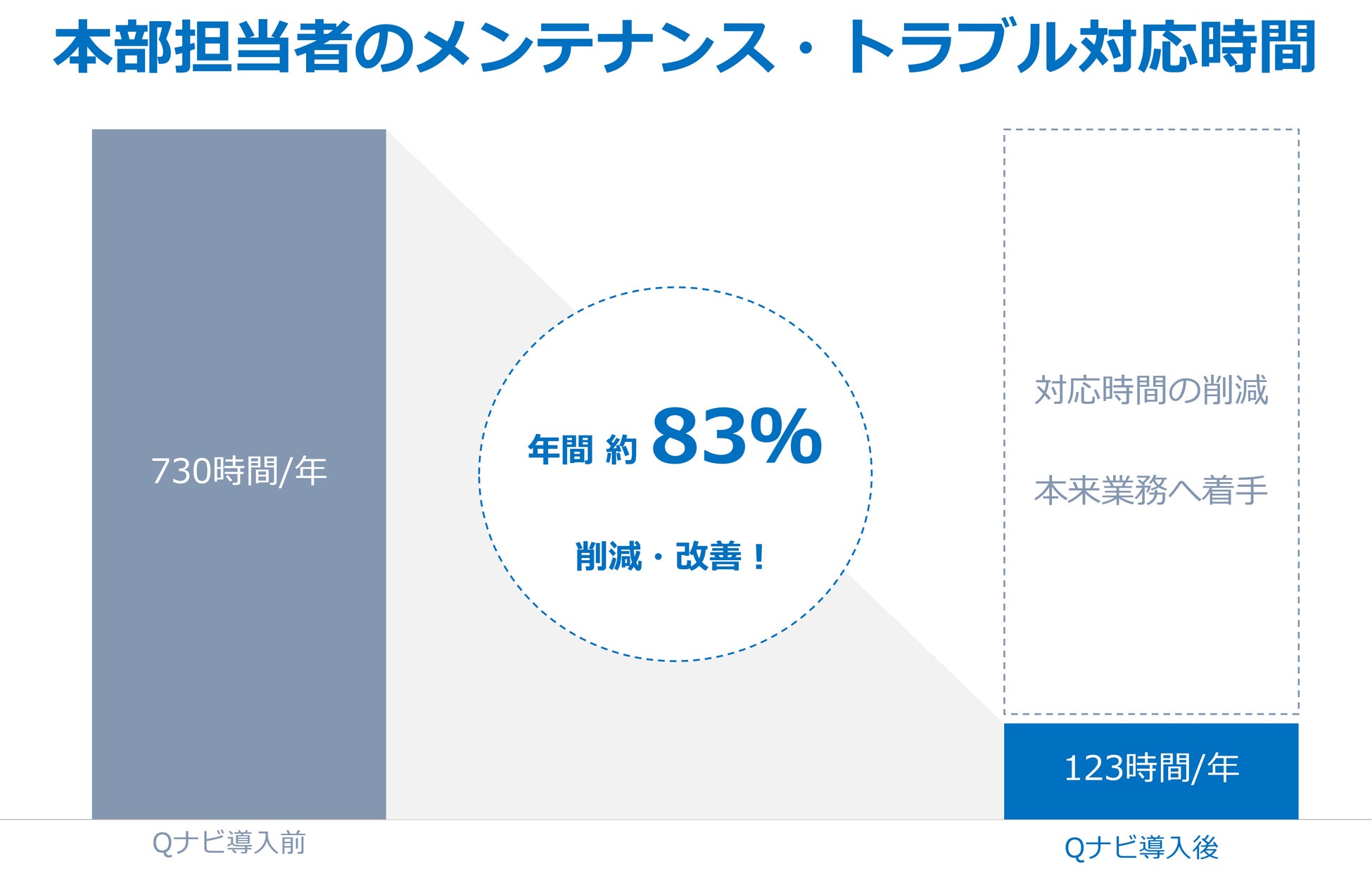 Qナビの導入により、店舗におけるメンテナンス対応時間が年間で83%削減された事例もあり、大幅な業務改善を実現できます。これまでの店舗トラブル発生時には、緊急対応可能な業者を探しての現地対応、トラブル対応後は、業者への費用支払いに係る経理担当者との情報共有、書類の提出等の多くの業務が発生します。Qナビはそのような業務をアプリ1つで完結し、メンテナンスに係る時間を削減し、本来業務(売上拡大、マーケティング、人材教育、メニュー開発 等)に専念でき環境を実現します。