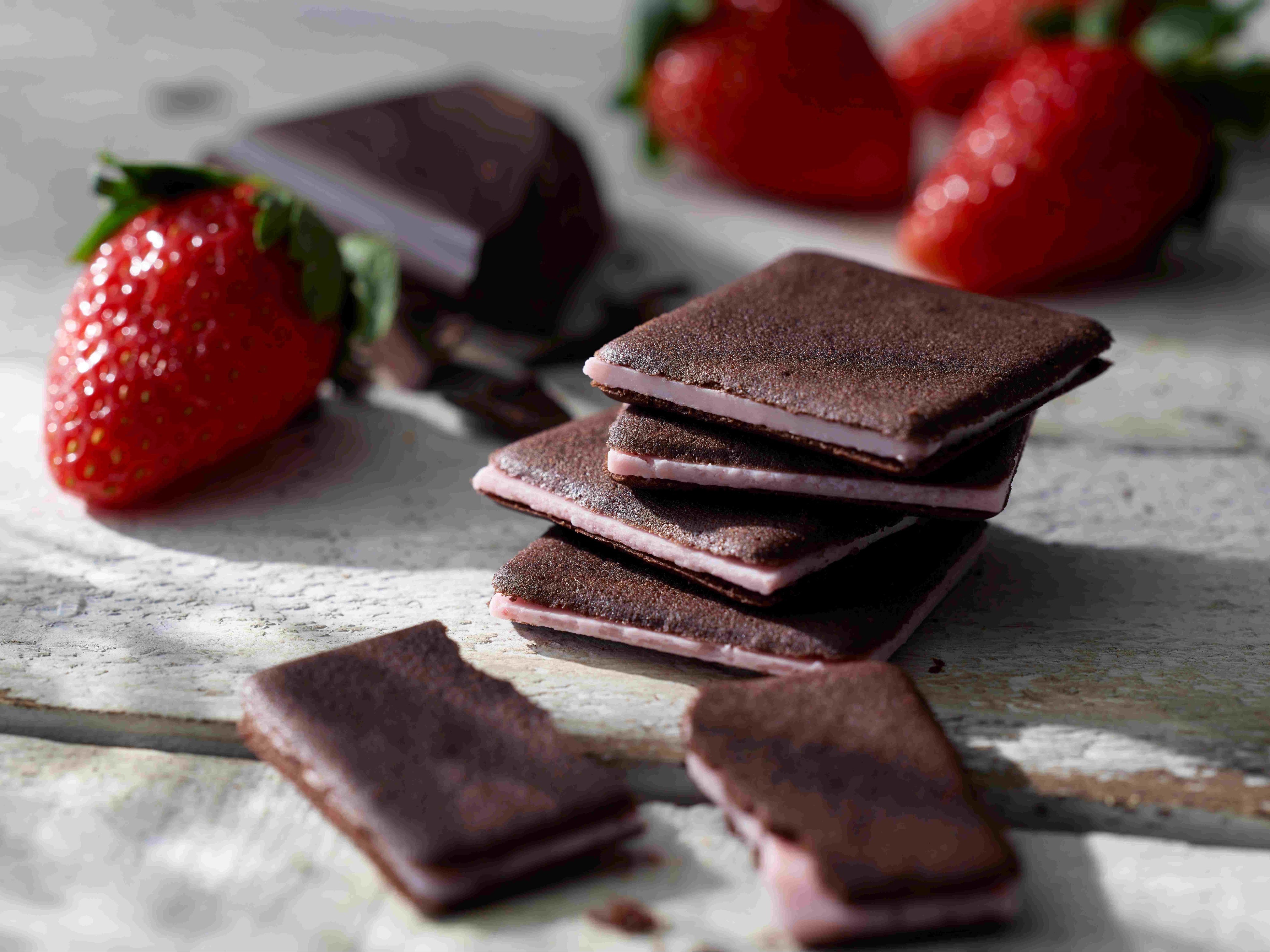 北海道産の苺を使用したチョコレートをサクッと軽いチョコレートクッキーでサンドしました。カカオのほろ苦さと苺の風味が絶妙な、誰からも愛される王道の味わいです。