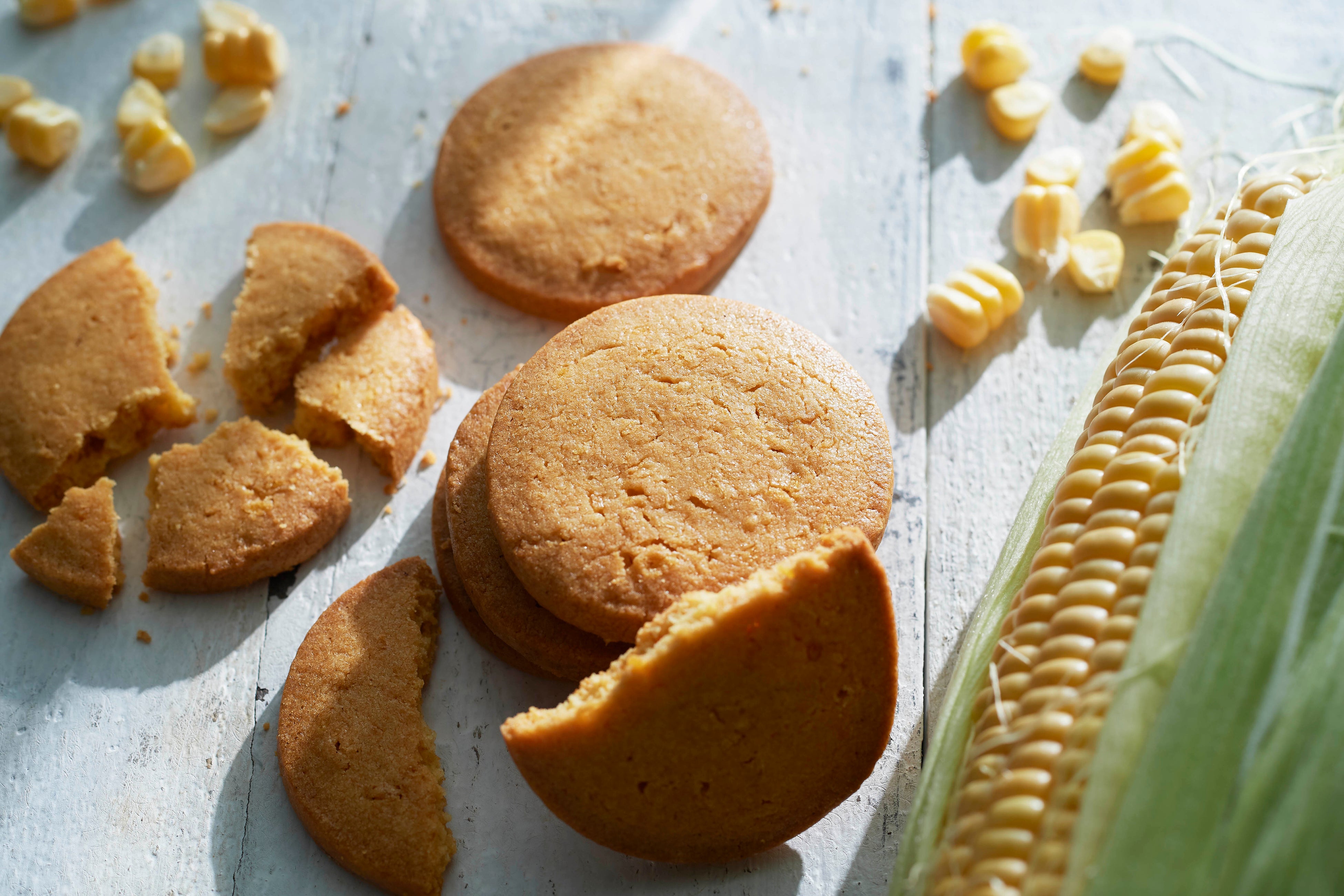 コーン本来の甘さを引き出すために、北海道産のコーンパウダーを使用しました。さらに、クッキーにはコーンフレークを入れて焼き上げることで、ザクザクとした、くせになる食感もプラス。コーン本来の甘みと、たのしい食感が特徴です。