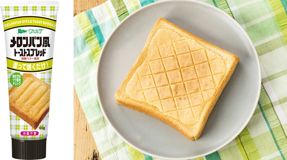 「メロンパン風トーストスプレッド」は、食パンに塗って焼くだけで、手軽にベーカリーのメロンパンのようなトーストが作れる商品です。メロンパンのクッキー生地のようなサクサクした食感が楽しめます。さらに発酵バターを使用しているため、焼き上がりに豊かな香りが楽しめます。