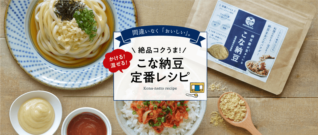 そのもの株式会社(本社:福岡県福岡市、代表:⽇⾼絵美)は、活力ある「人生100年時代」の実現に向けて、健康寿命の更なる延伸が課題となっているなか、最も重要な要素の一つである栄養・食生活でよりおいしく、手軽に食事を楽しんでいただくための取り組みとして、sonomono公式サイトにて、調理師・管理栄養士の資格を持つ料理研究家・角田佳子先生監修のもと、絶品コクうま!『こな納豆定番レシピ』を公開しました。