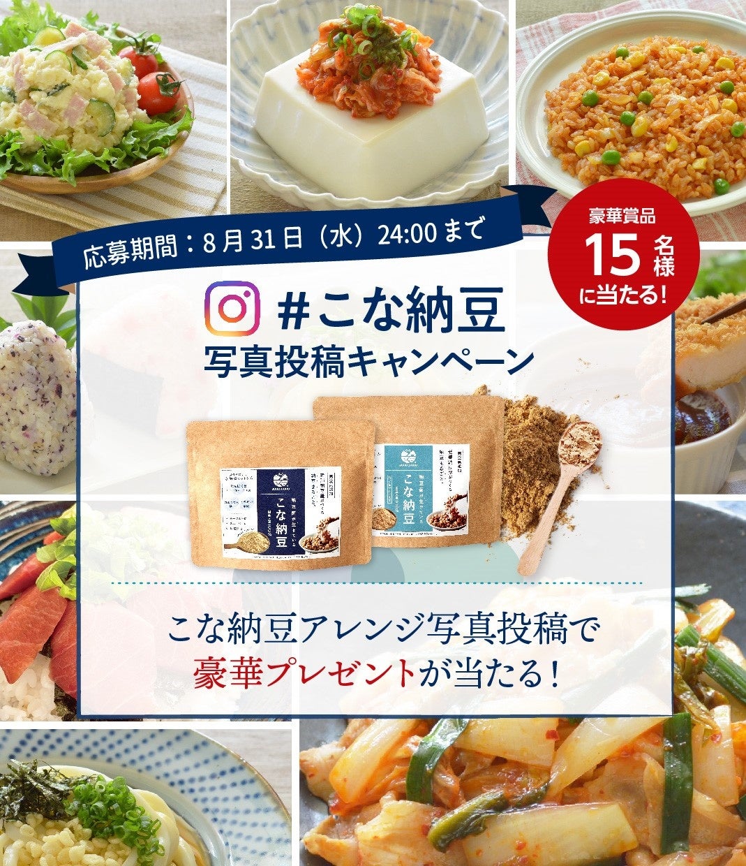 こな納豆アレンジ写真を3つのハッシュタグ(#こな納豆 #こな納豆レシピ #こな納豆アレンジ2022)付きで投稿すると、合計15名様に豪華プレゼントが当たる!
