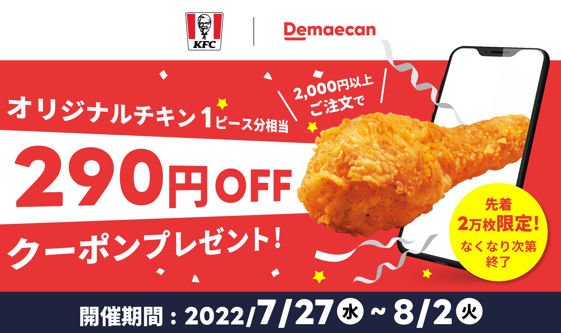 今回、加盟店舗が拡大したことを記念して、2022年7月27日(水)~2022年8月2日(火)に先着2万枚限定で、「ケンタッキーフライドチキン」のオリジナルチキン1ピース分相当の290円オフクーポンを配布いたします。さらに、2022年8月29日(月)~2022年9月4日(日)で対象の「ケンタッキーフライドチキン」にて、送料無料に加え、800円以上のご注文で100円オフになるお得なキャンペーンを開催いたします。なお、両キャンペーンともに、「ケンタッキーフライドチキン」の配達代行店舗が対象となります。