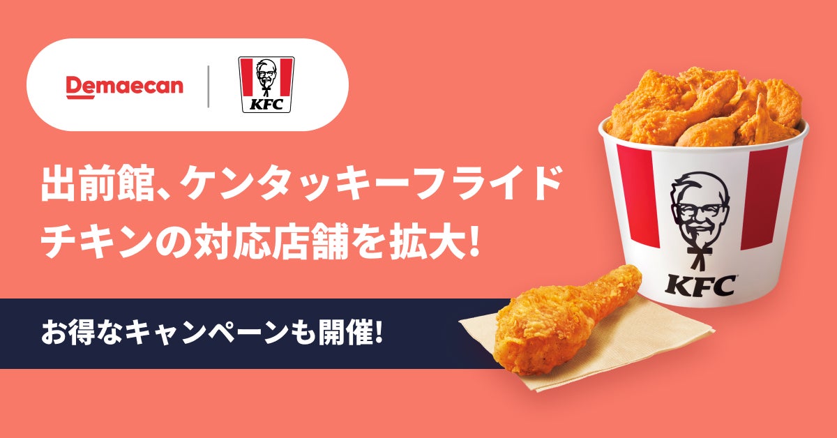 日本最大級のデリバリーサービス『出前館』(運営:株式会社出前館、本社:東京都渋谷区、代表取締役社長:藤井英雄)はファストフードチェーン「ケンタッキーフライドチキン」(運営:日本ケンタッキー・フライド・チキン株式会社、本社:神奈川県横浜市、代表取締役社長:判治孝之)のデリバリー対応店舗が約300店舗へと拡大したことをお知らせします。また今回、店舗拡大を記念して、2022年7月27日(水)より、キャンペーンも開催いたします。