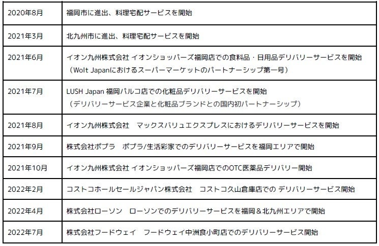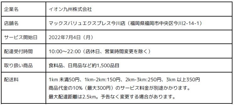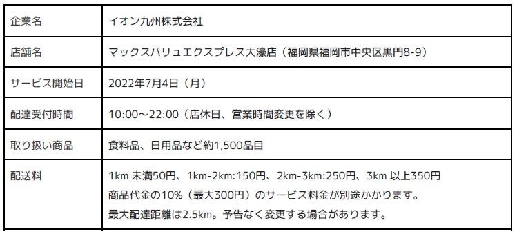 また、2022年7月4日(月)より、「マックスバリュエクスプレス大濠店」(福岡市中央区)「マックスバリュエクスプレス今川店」(福岡市中央区)の2店舗でもデリバリーサービスを開始し、Woltを導入したイオン九州(株)傘下のスーパーマーケットは福岡県内10店舗に拡大いたしました。Woltでは今後もリテール(小売)分野でのパートナーシップを拡充し、忙しい子育て・共働き世代の方や、日常のお買い物が困難な方など、幅広い層の多様なニーズに対応する「Qコマース」の認知と利用促進を目指してまいります。