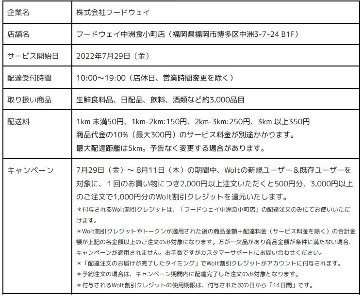デリバリーサービス「Wolt(ウォルト)」を展開するWolt Japan株式会社では、福岡エリアにおけるQコマース(食料品や日用品の即時配達サービス)をさらに強化いたします。このたび株式会社フードウェイ(本社:福岡市早良区)と新たに提携し、2022年7月29日(金)より「フードウェイ中洲食小町店」でのデリバリーサービスをスタート、生鮮食料品や日配品、飲料や酒類など約3,000品目を取り扱い、店舗から約5キロ圏内に30分程度でお届けします。