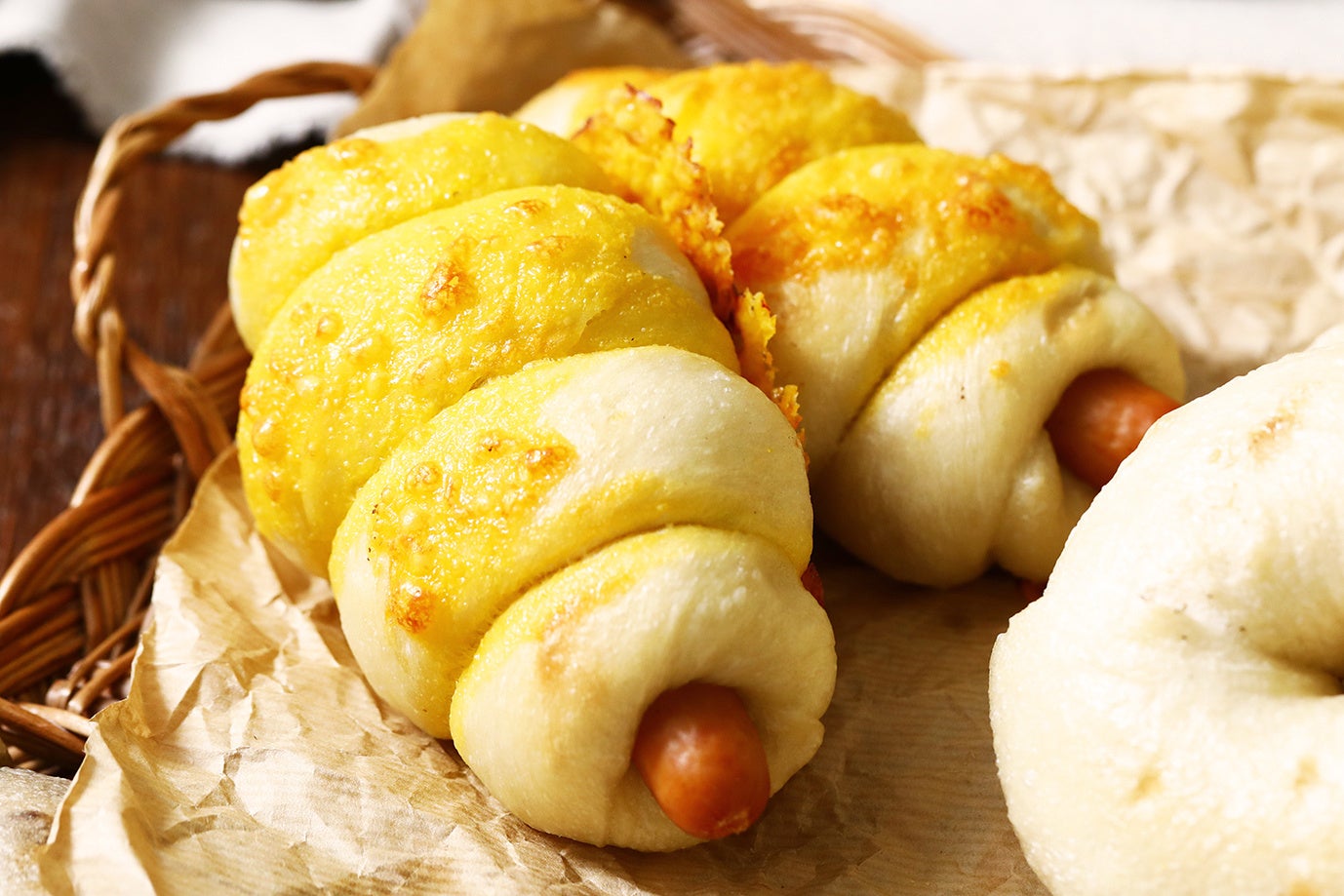 粗挽きソーセージにベーグル生地を巻き、チーズをのせて焼き上げたお子様も大好きな惣菜系ベーグルです。