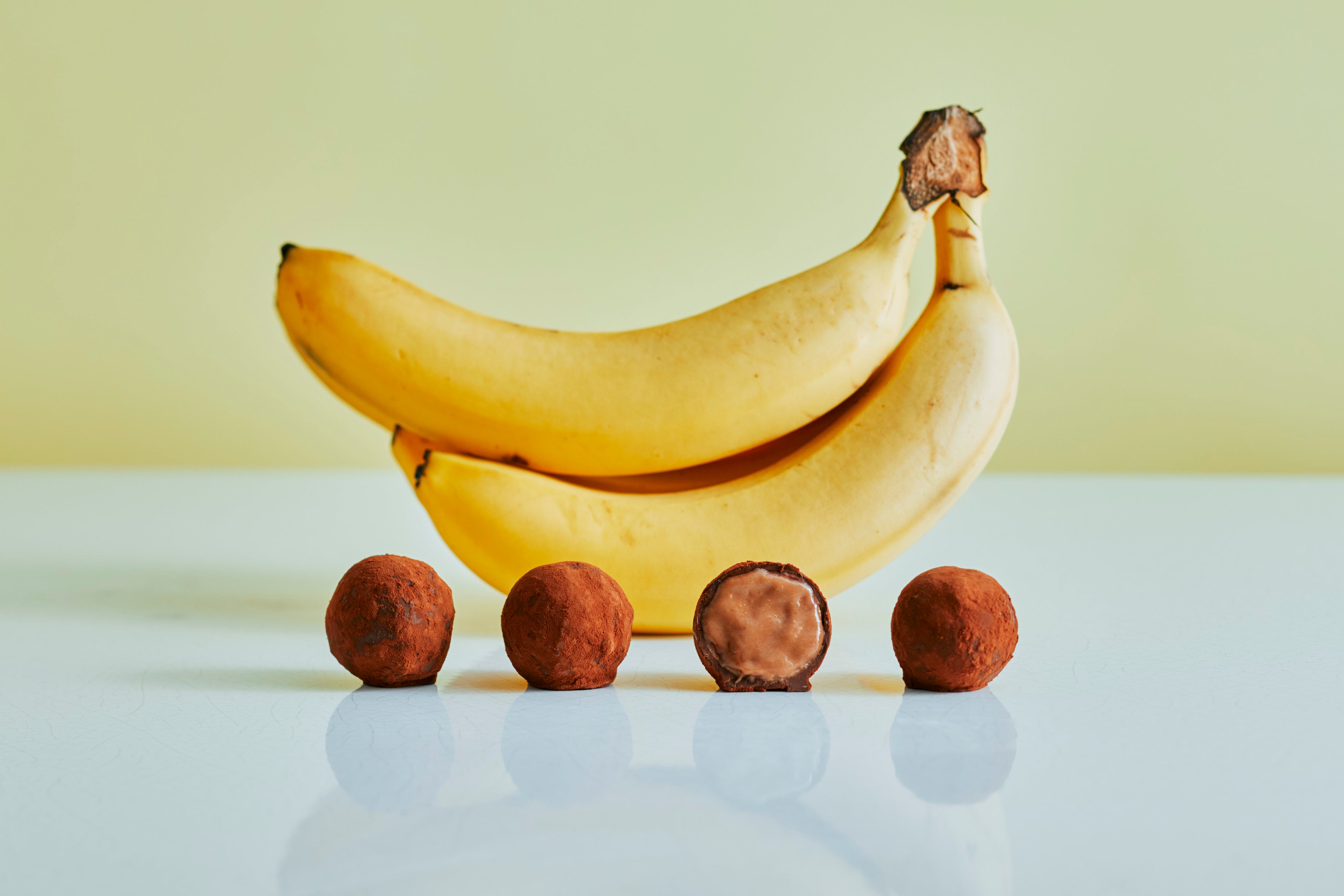 バナナのフレッシュさを表現するために、生のバナナをピューレにし、まろやかな甘みのミルクチョコレートとアーモンドミルクを加えて味わいに深みを出しました。薄いミルクチョコレートのコーティングと、中からとろけ出す瑞々しいショコラの食感も楽しい一品です。