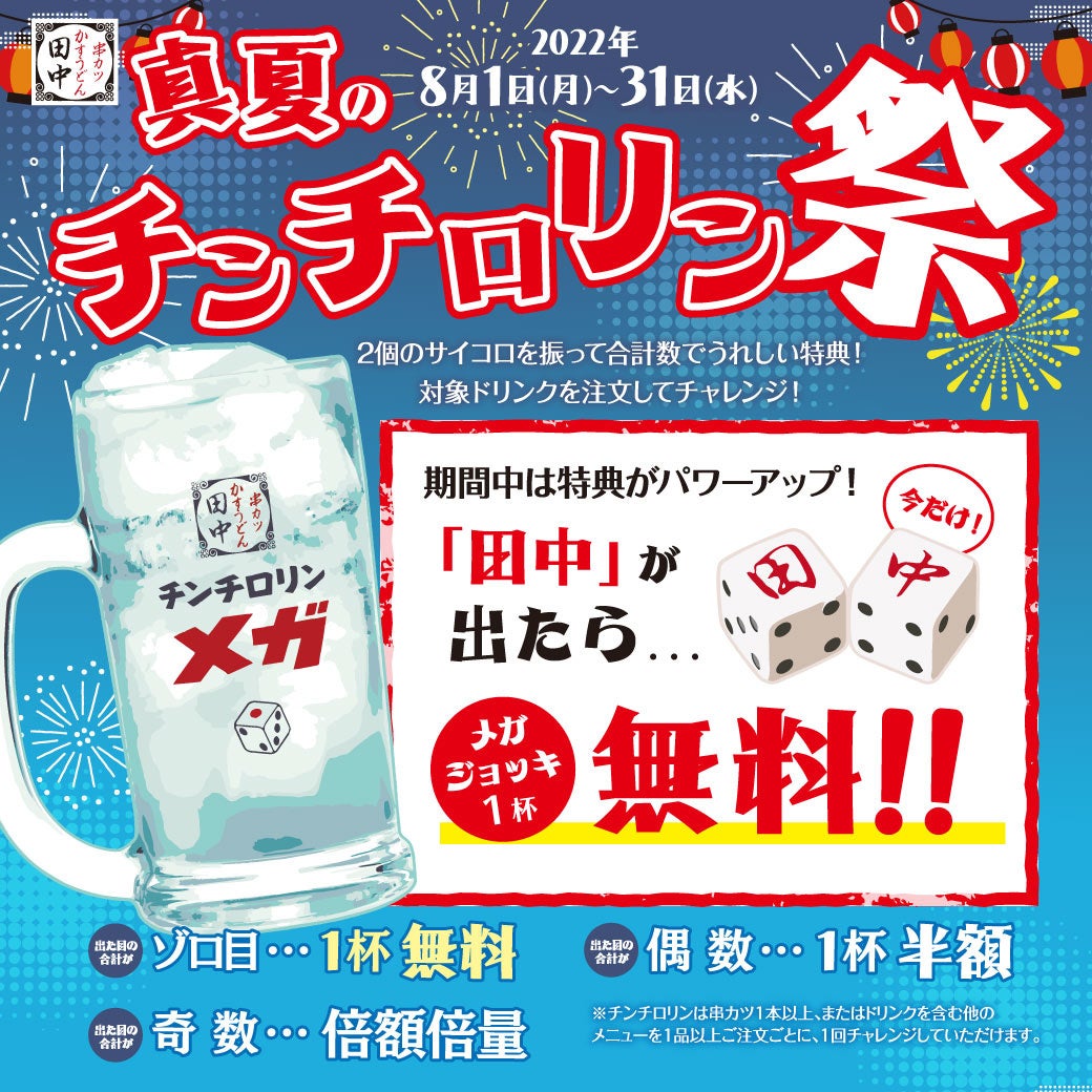 期間中、チンチロリンドリンクの特典がパワーアップし、2個のサイコロを振って「田中」の目が出ると対象ドリンクのメガジョッキ1杯が無料になります。厳しい暑さのなか、少しでも串カツ田中で楽しくお得に過ごしていただける機会になればと考えています。