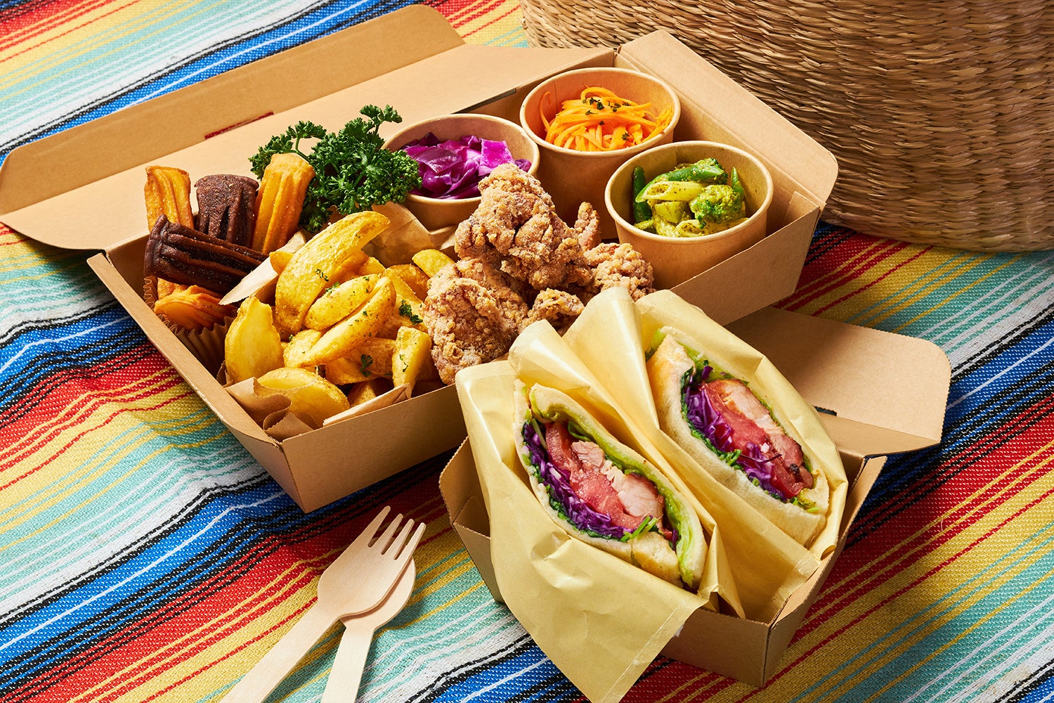 ピザなどのカフェメニュー以外に、テイクアウトメニューもご用意。ホットサンド・3種デリ・フライドチキン・フライドポテト・スティックドーナツがセットになった「ピクニックセット(1680円)」は、レンタルレジャーシート付き。芝生の上でのんびり青空を眺めたり、見晴らしの良いベンチに座りながら、テイクアウトメニューをお子さまとシェアしてみてはいかがでしょうか。