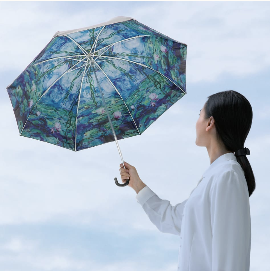 モネの「睡蓮」やクリムトの「フラワーガーデン」がプリントされた晴雨兼用の折り畳み傘です。UVカット率99%で紫外線や日差しの暑さから大切な方を守ります。「黒地」と「絵柄」の二重張りとなっており、外側と内側で見え方が異なるため、場面を選ばずお使いいただけます。折り畳んでも、折り畳まなくても束ねることができるバンドが付いており、外出の多い方にもおすすめです。