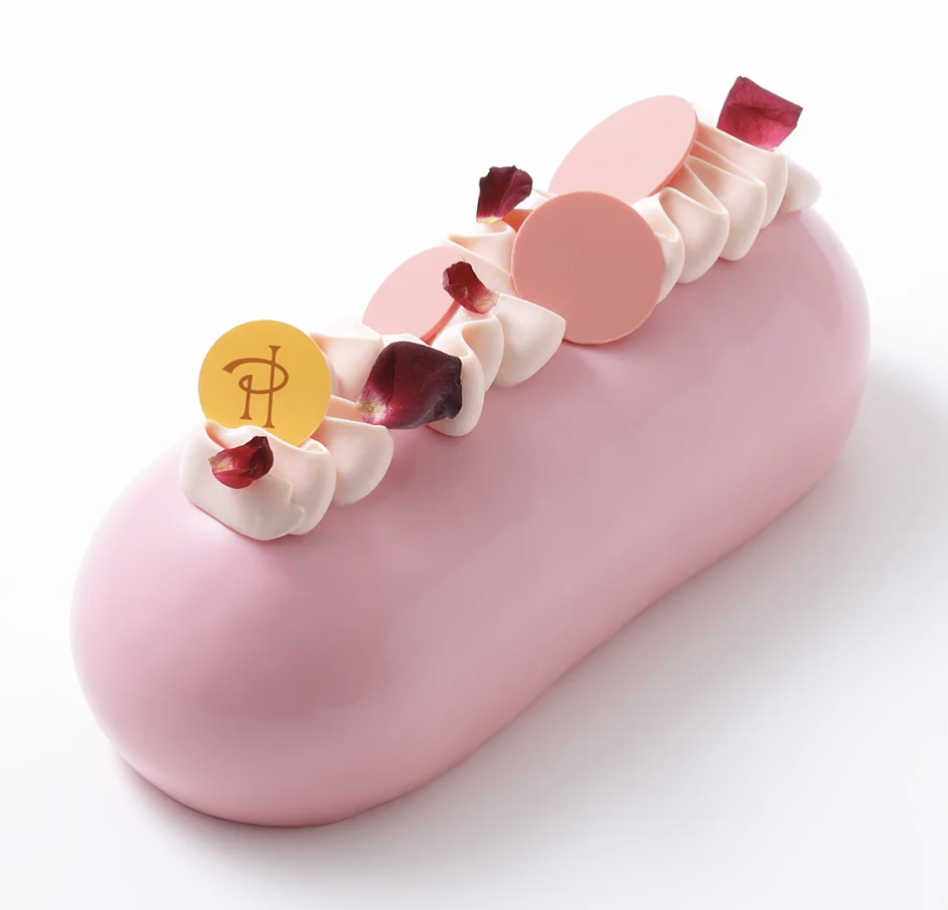 メゾン ピエール・エルメ・パリの象徴的なフレーバーの組み合わせであるイスパハンが、大胆な様相を帯びています。マカロンのビスキュイをベースにしたローズ花弁入りライトクリームの柔和で甘美な食感が、ローズ入りビスキュイのまろやかさと並んで、華やいだライチの味わいとも見事に調和しています。甘酸っぱいフランボワーズのコンポートが、すがすがしい酸味のアクセントで全体を盛り上げています。