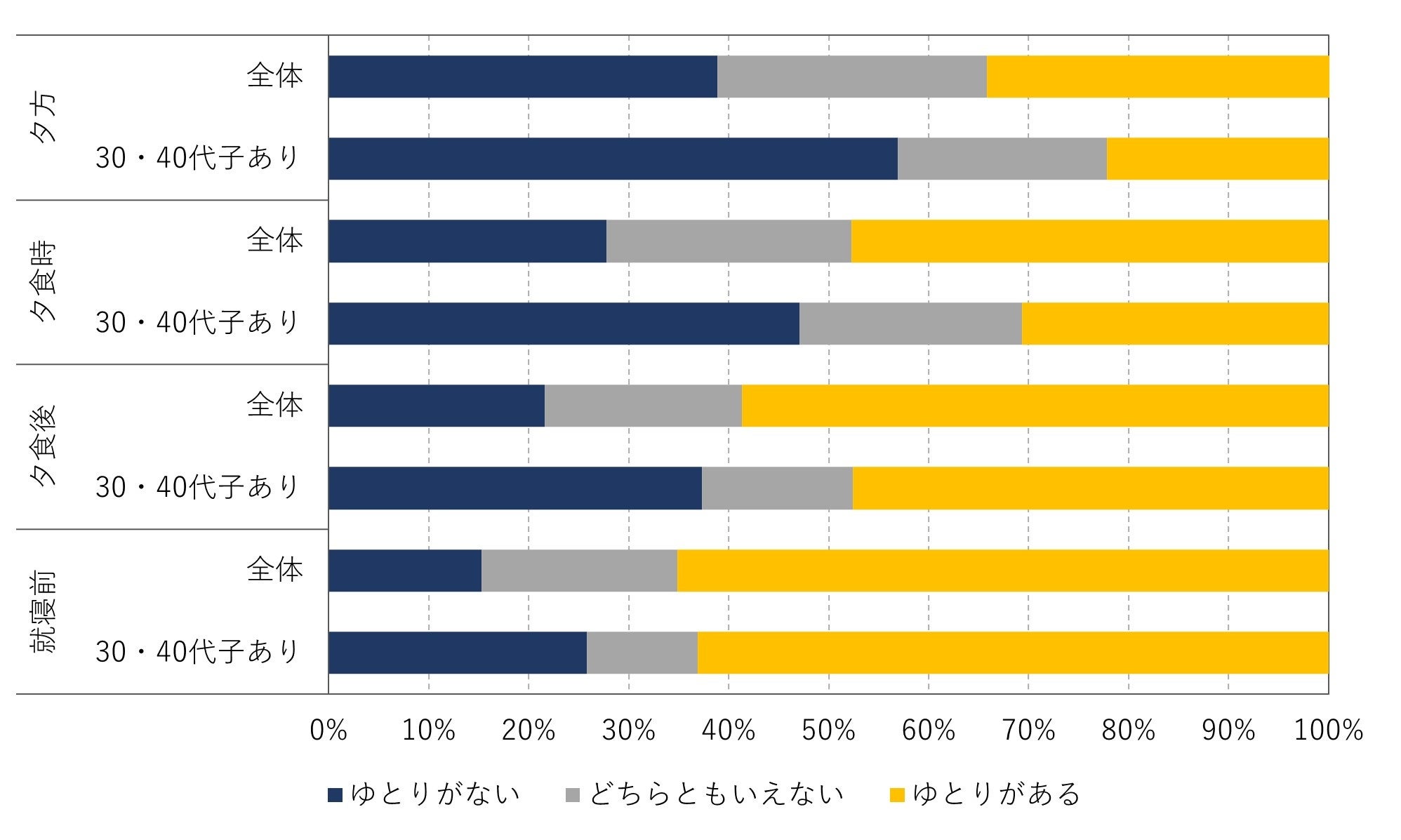 また、夕方〜夜にかけた時間帯別の「ゆとり時間」について聞いたところ、「子供をもつ30〜40代」の「ゆとり時間」が全体と比べて短い傾向であることが明らかになりました(図2)。全時間帯において「ゆとりがない(※)」と回答した「子供を持つ30~40代」の割合が全体と比べて多く、夕方~夕食後において「ゆとりがある(※)」と回答した「子供を持つ30~40代」の割合が全体と比べて少ない結果となりました。