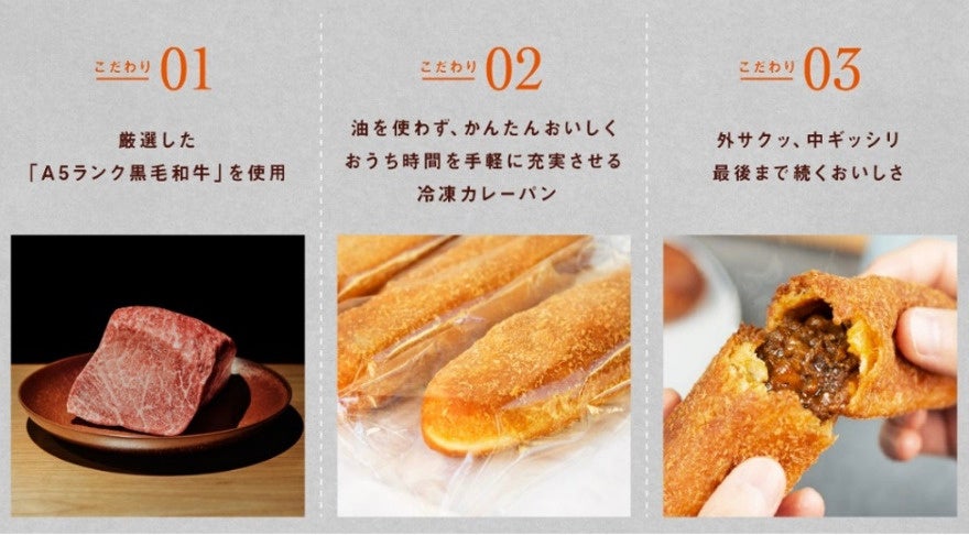 もとむのカレーパンは、“黒毛和牛の美味しさを追い求め”、“たくさんの人に求められる”ようなカレーパンを届けたいという想いを込めて誕生しました。東京の食文化の台所とも言われる築地の焼肉店「築地焼肉もとむ」の人気メニューの牛すじカレーをベースに、厳選した「A5ランク黒毛和牛」を、さくっと軽い食感のパンの中に贅沢に詰め込んだこだわりの逸品です。全長18cmのパンの中にA5ランクの黒毛和牛を贅沢に使用しています。独自の冷凍技術と揚げ&焼き製法でヘルシーに仕上げたさくっと軽い食感のカレーパンです。
