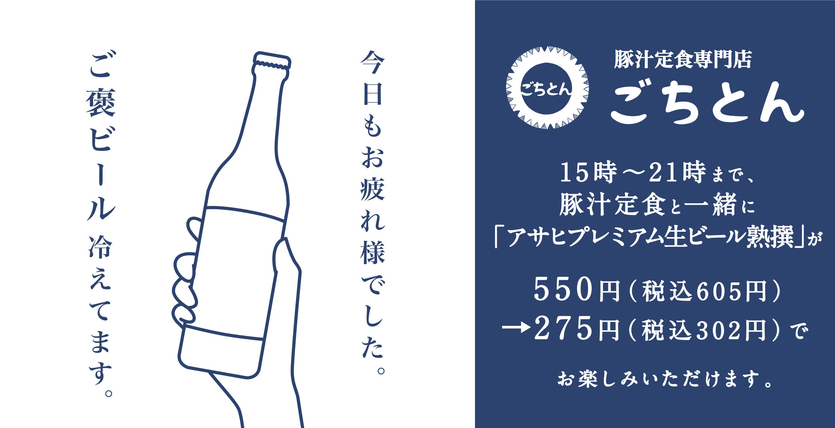 15時~21時まで、豚汁定食とご一緒に「アサヒプレミアム生ビール熟撰」が通常価格550円(税込605円)のところ、275円(税込302円)で販売いたします。