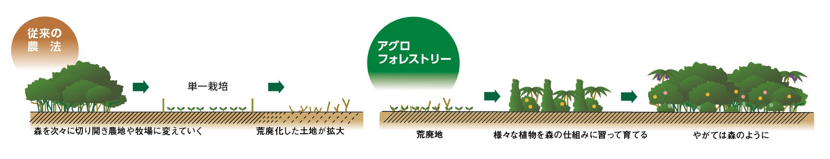 *1 アグロフォレストリーとは、一般的な単一栽培ではなく、荒廃した土地に様々な種類の樹木や果樹を植え、草原が遷移して森になる自然のシステムを模倣するように農場を構成していく農法(生産システム)です。世界では東南アジア、中南米、アフリカなどで多くの事例があり、それらの多くは伝統農法として地域に根付いています。その中でも、CAMTA(ブラジル・アマゾン川の河口の町でパラ州の州都であるベレンから約230km離れたトメアス地区にあり、日本人移住者によって作られた農協)が実践しているアグロフォレストリーは、商業的に成り立っている数少ない成功例であり、持続可能な農業として世界から注目されています。