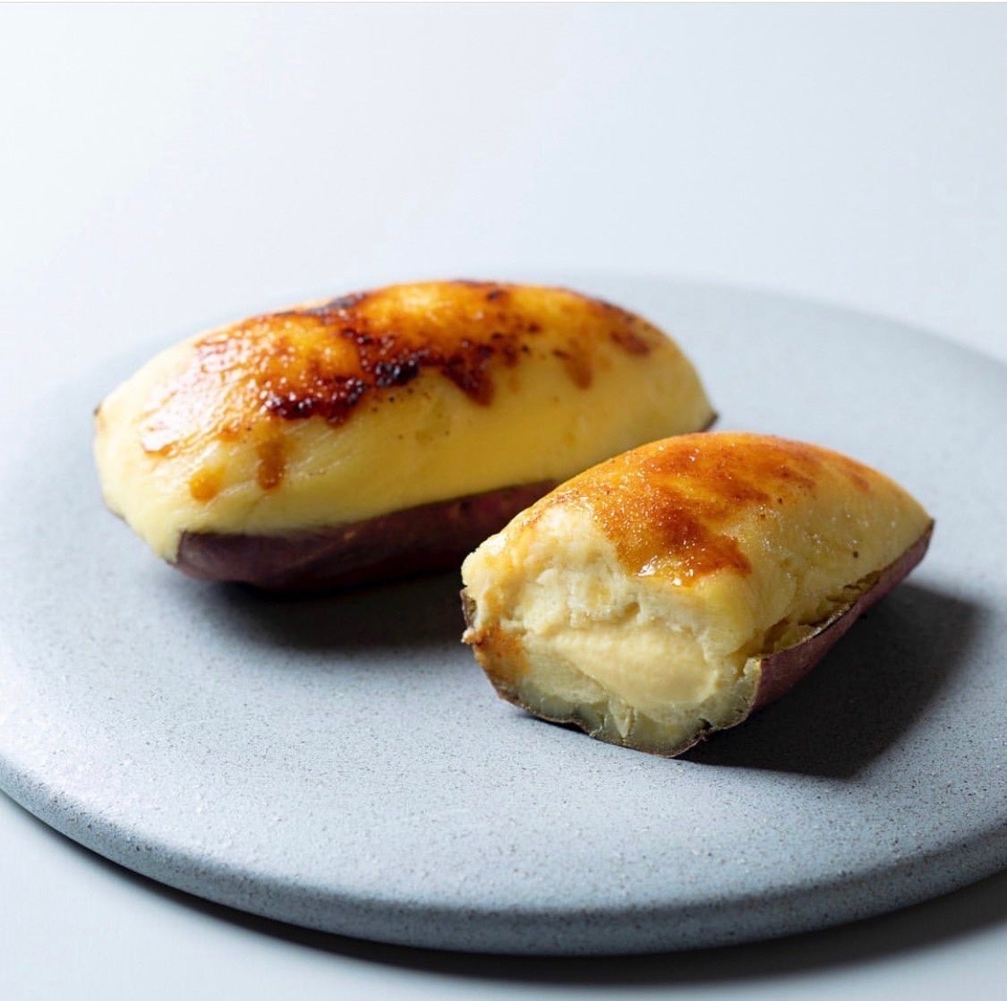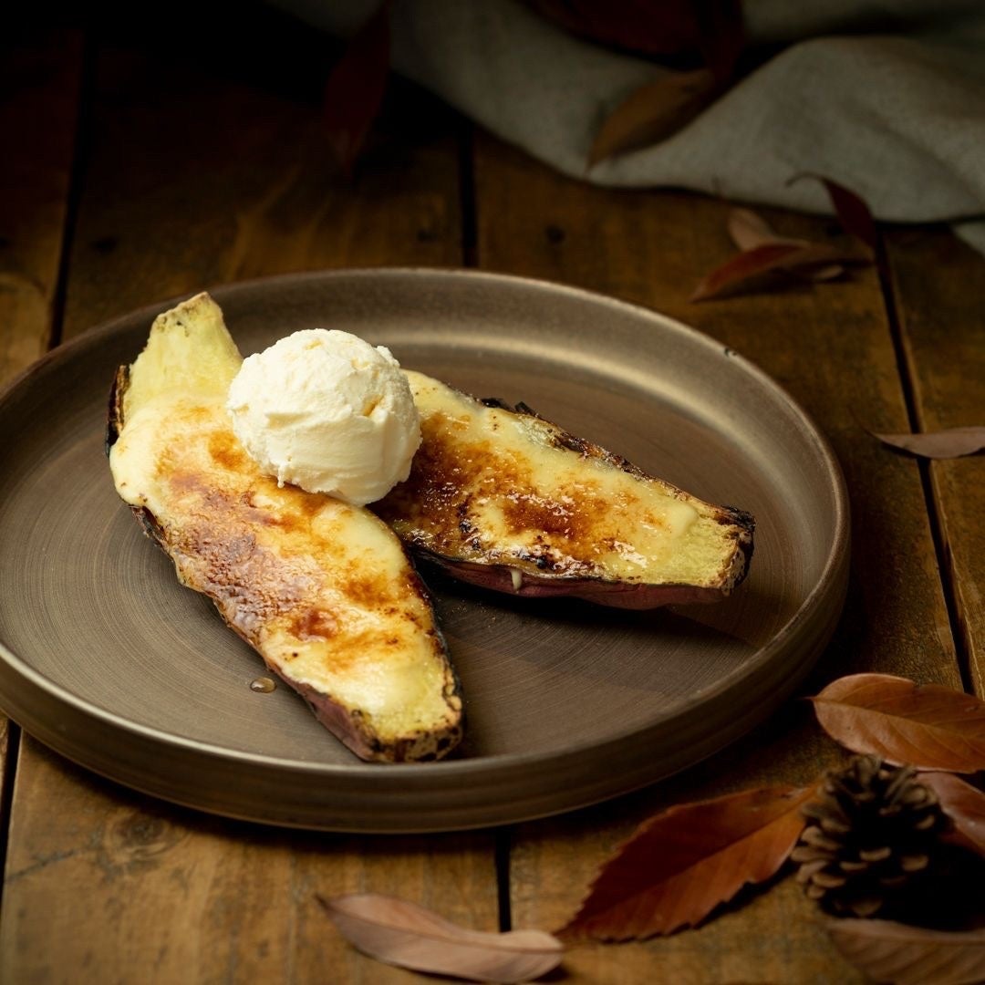 しっとりと焼き上げた紅はるかの焼き芋に、国産の卵を使用して作ったカスタードクリームをふんだんにかけ、グラニュー糖をブリュレしてご提供します。お好みでバニラアイスを添えていただくことで、さらに美味しくお召し上がりいただけます。