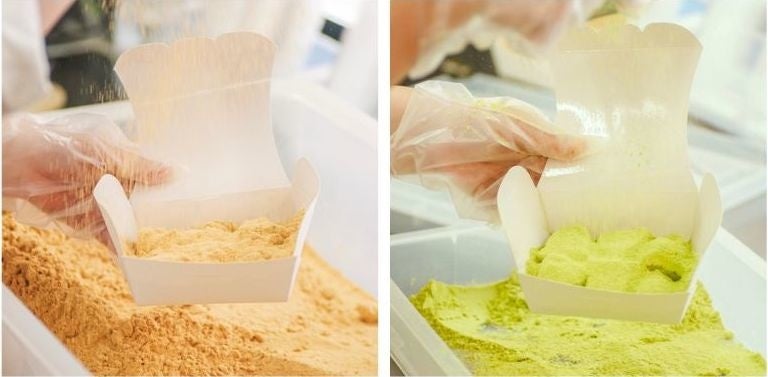 初めてお召し上がりいただいたお客様からは「こんなわらびもちは食べたことがない!」とのお声をいただきます。味のバリエーションは2種。王道の「和三盆」、ほろ苦さがわらび餅との相性抜群の「抹茶」です。 人気の抹茶味は京都祇園で160年以上の歴史を誇る老舗茶屋「北川半兵衛商店」の抹茶をふんだんに使用しており、少しの苦味の中に甘さを感じる上品な風味を味わえます。