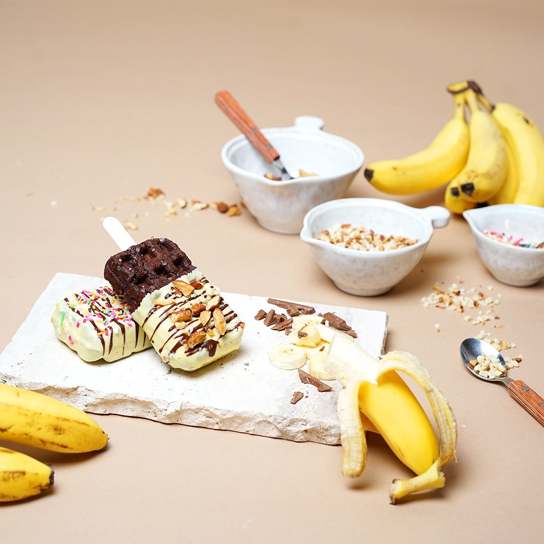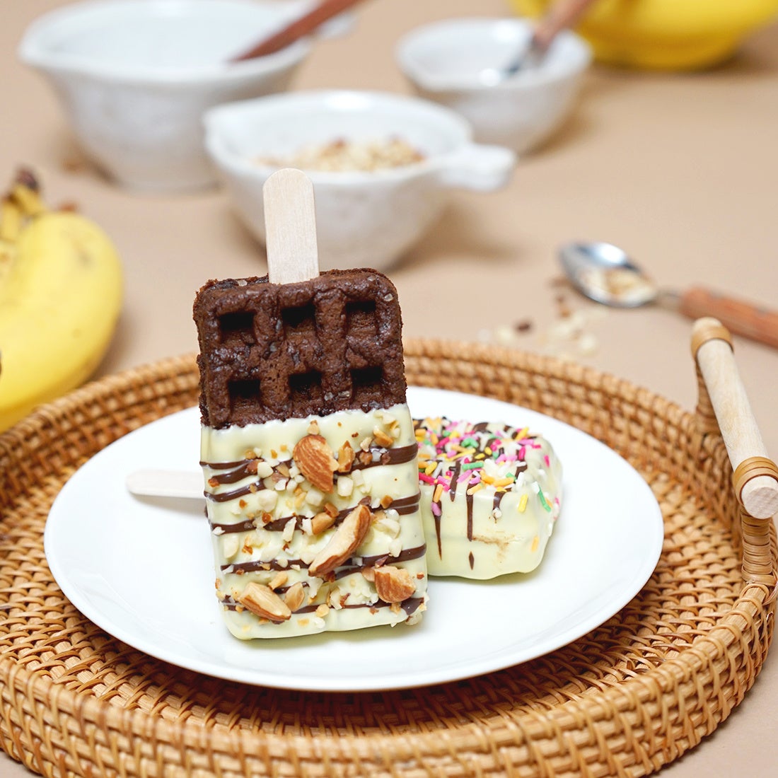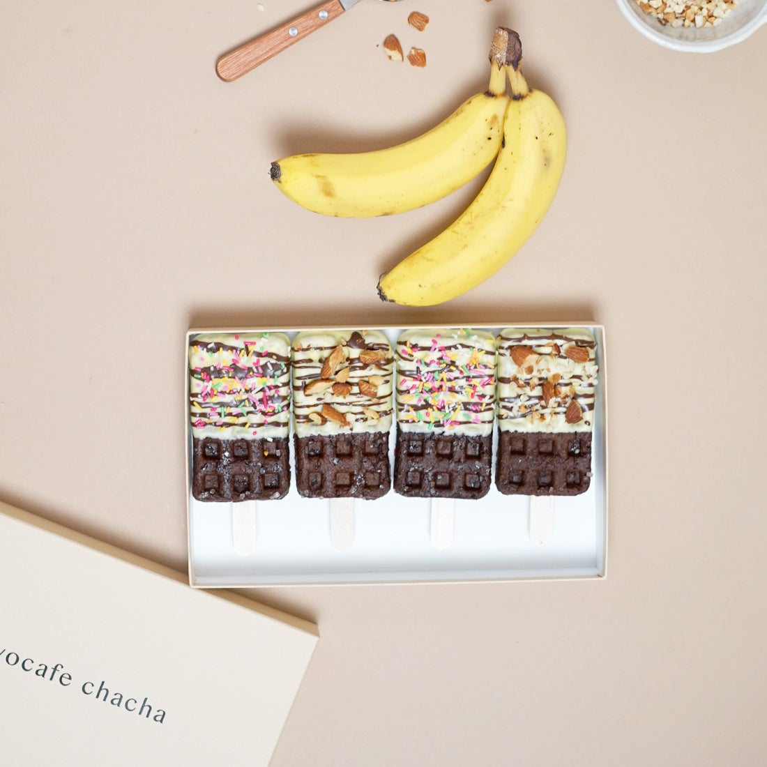 『冷やして食べる京ワッフル 〜チョコバナナ〜』は、夏の風物詩である”縁日”の屋台に並ぶチョコバナナをイメージした、華やかなフレーバーです。