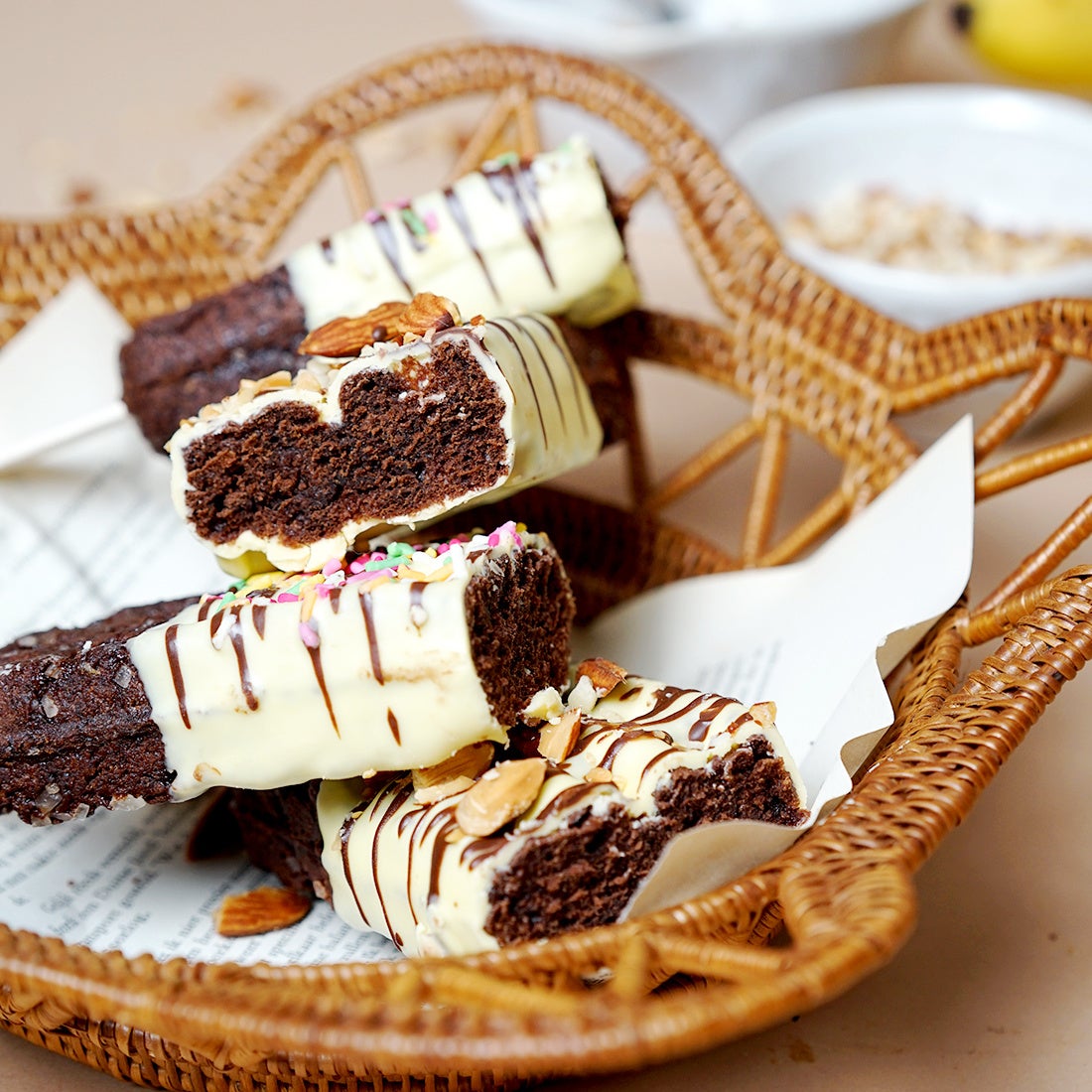 大粒ザラメが入った生地に、ココアパウダーをたっぷり練り込み、ブラウニーのように濃厚な京ワッフル。完熟バナナ風味のバナナチョコを分厚くディップし、本物のチョコバナナのような「パリッ」とした食感に。トッピングは、カラースプレーver.とナッツver.の2種類展開。