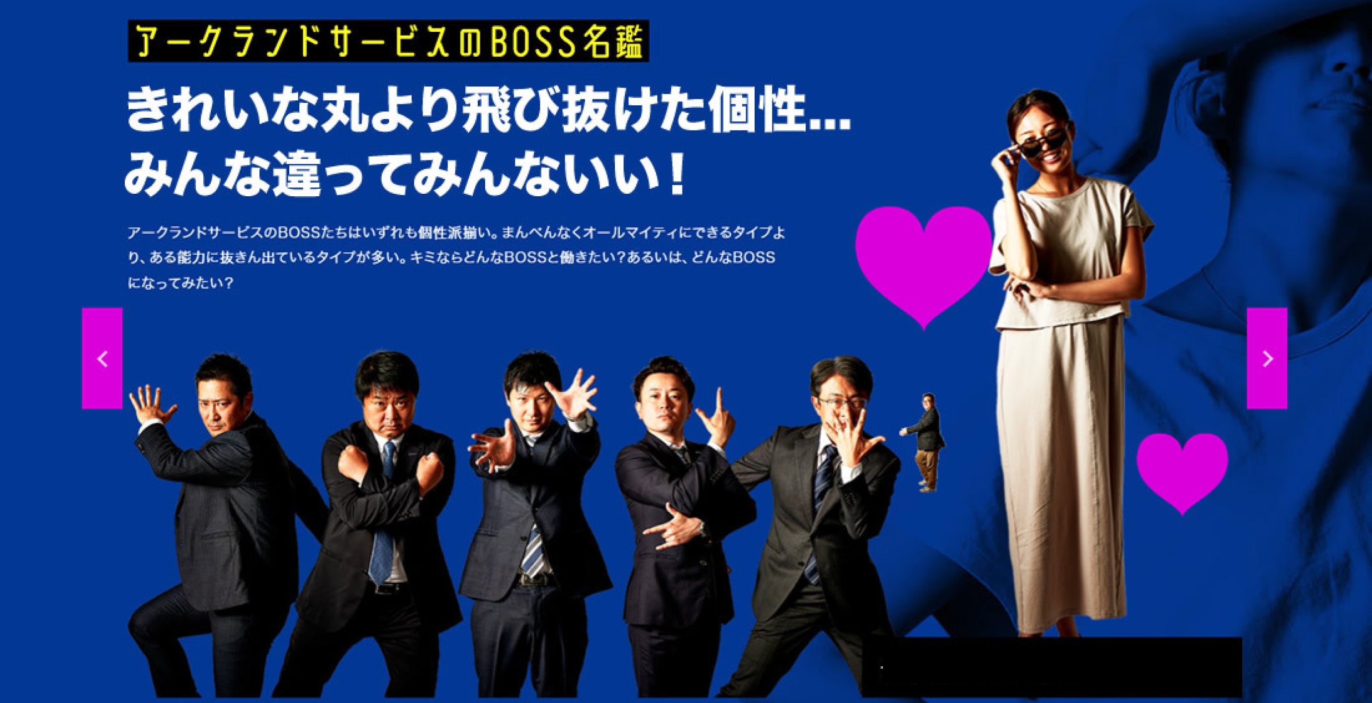 新卒サイト内に登場するのは、アークランドサービスで働く皆と共に切磋琢磨するBOSSは個性派揃い。