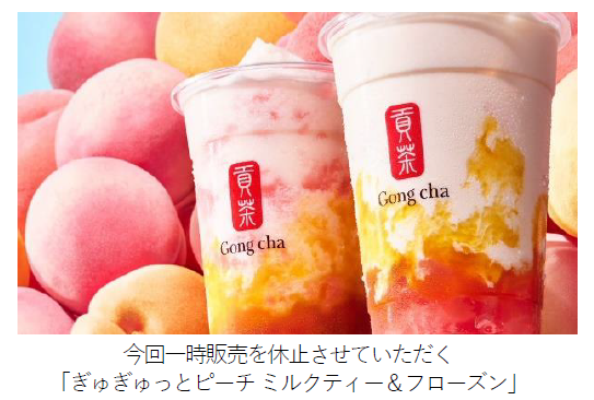 株式会社ゴンチャ ジャパン(本社:東京都港区、代表取締役社長:角田 淳、以下GCJ)は、2022年7月29日(金)~8月6日(土)の9日間、今夏の期間限定商品「ぎゅぎゅっとピーチ ミルクティー」と「ぎゅぎゅっとピーチ フローズンティー」について、販売を一時見合わせることとなりました。代わりに、上記期間中、「いちご杏仁 阿里山 ミルクティー」および「いちご杏仁 阿里山 フローズンミルクティー」を販売いたします。