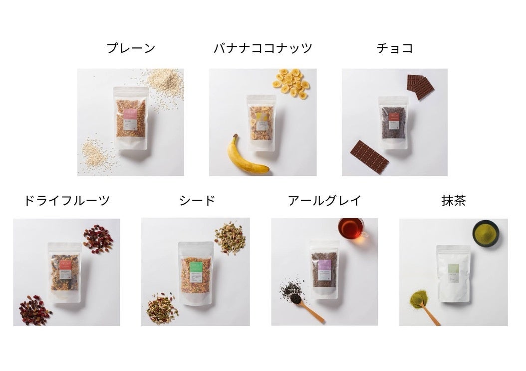 (フレーバー:プレーン / チョコ / バナナココナッツ / シード / ドライフルーツ/アールグレイ/抹茶 )