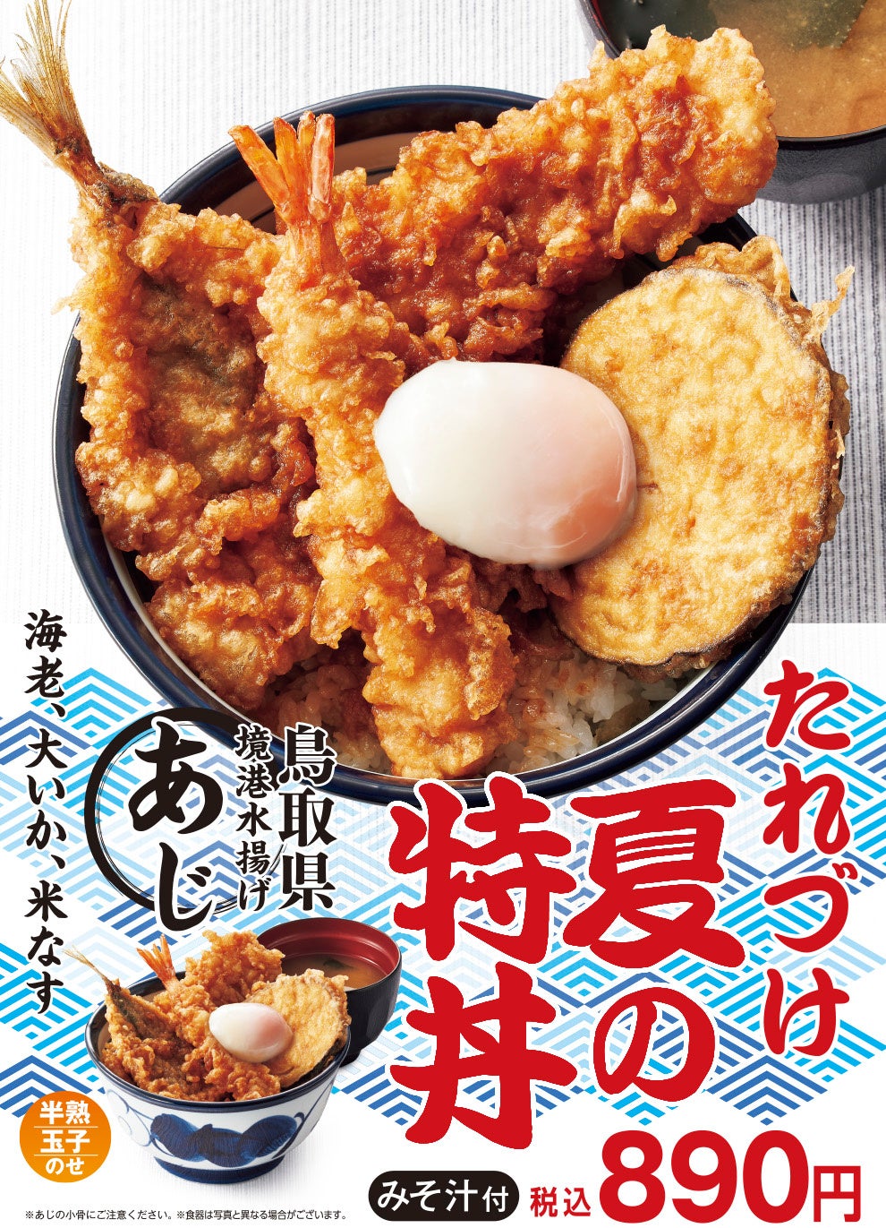 昨年好評だった「たれづけ夏の特丼」が再登場。天ぷらをまるごと甘辛たれにくぐらせた「海老」・「大いか」・「米なす」・肉厚ふっくら鳥取県境港水揚げ「あじ」は、半熟玉子とも相性抜群です。