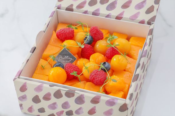 旬のマンゴーを一面に敷き詰めたボックスケーキ。
