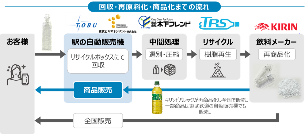 今回、当社と東武鉄道は、同社路線内に設置されているリサイクルボックスの回収を一括して行うスキームと、路線内で集まったペットボトルを再びペットボトルへ再生する循環サイクルを共同で構築し、先行して運用開始します。