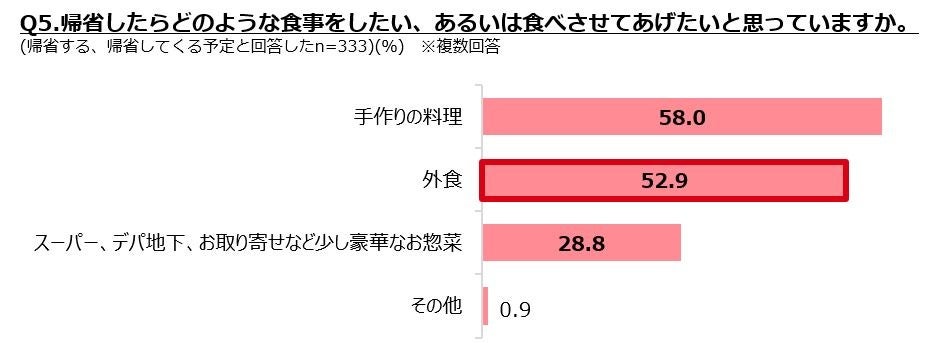 帰省時の食事については、手作りの料理で楽しむ人が多い一方、外食を楽しみにしている人も半数以上となりました。