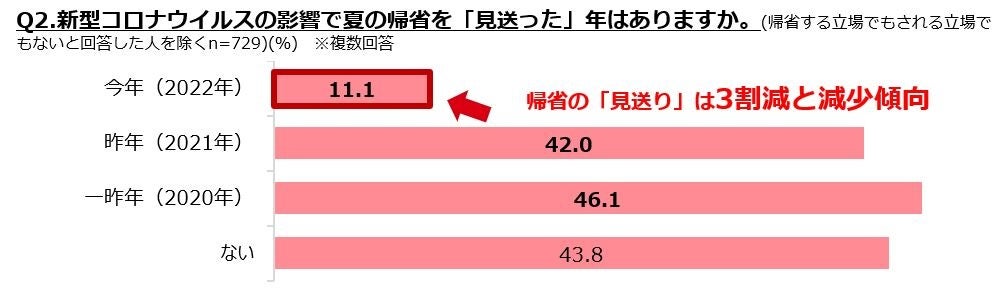 ・感染拡大の影響による帰省見送りは、過去2年は40%以上だったが、今年は3割以上減って11%に。