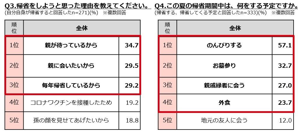 ・帰省の理由は「親が待っている」「親に会いたい」「毎年帰省している」がTOP3。