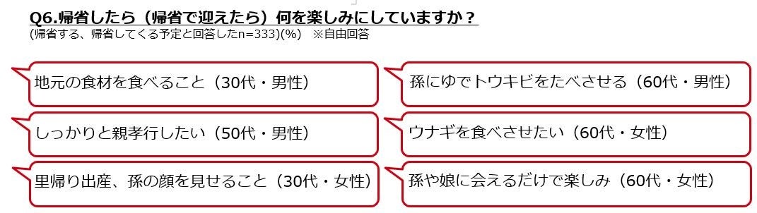 自由回答では、「地元の食材をたべること」「ウナギを食べさせたい」「孫にゆでトウキビを食べさせたい」といった回答が寄せられており、地元の味を楽しみたい、楽しんでほしいという想いもあるようです。