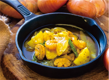 「泉州黄玉葱」の特徴でもある玉葱本来の甘みを含んだ「水分」を逃がすことなく味わうことができるアヒージョです。凝縮された旨味、素材の味を感じられ、ごはんにもパンにも合います。
