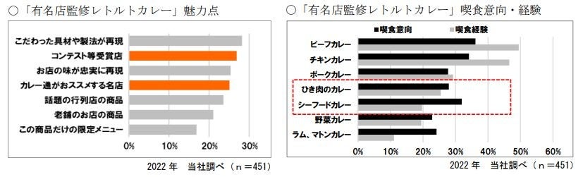また、喫食経験が少ない具材を「有名店監修」という切り口で味わってみたい、という意向が高くあり、カレー専門店ならではのハンバーグやシーフードという新たな具材のカレーを発売することで、レトルトカレーカテゴリーのさらなる活性化が期待できます。