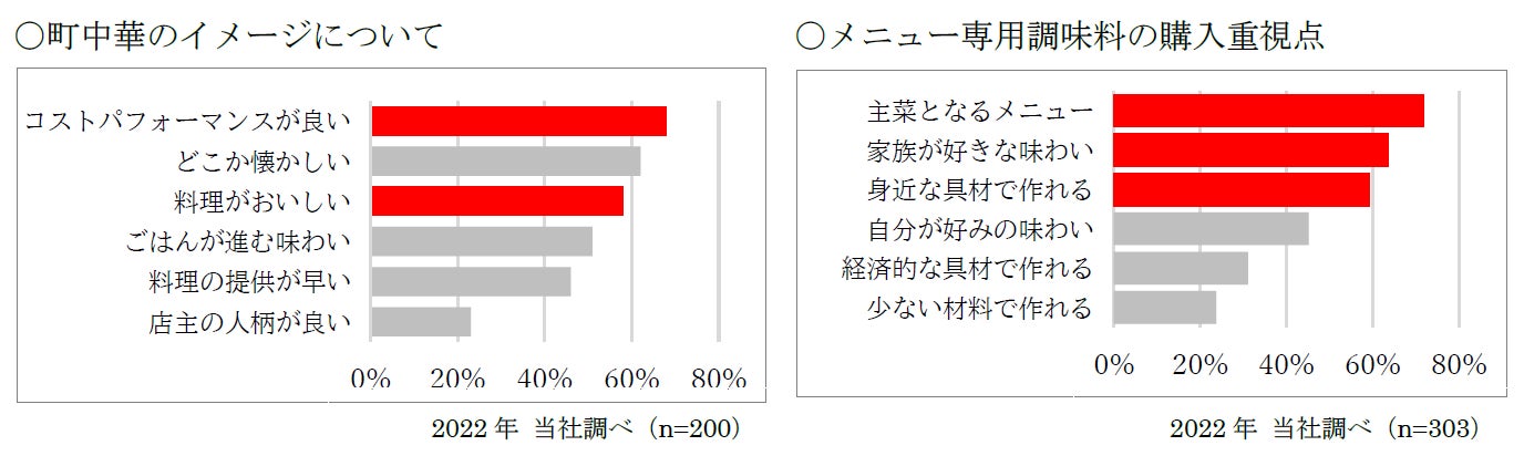 「町中華」に対し、コストパフォーマンスの高さや、ボリュームがありごはんの進むおいしさ等のイメージが幅広い世代で広まっています。また、メニュー専用調味料を購入する上で、家族の好みの味、身近な具材で作れる主菜となるメニュー、手軽に調理できることを重視していることが伺えます。