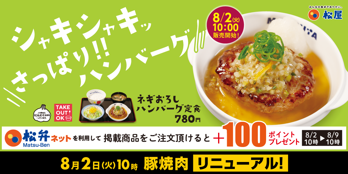 8月2日10時~8月9日10時まで、松弁ネットを利用して「ネギおろしハンバーグ」をご注文頂けると、100ポイントプレゼントいたします。