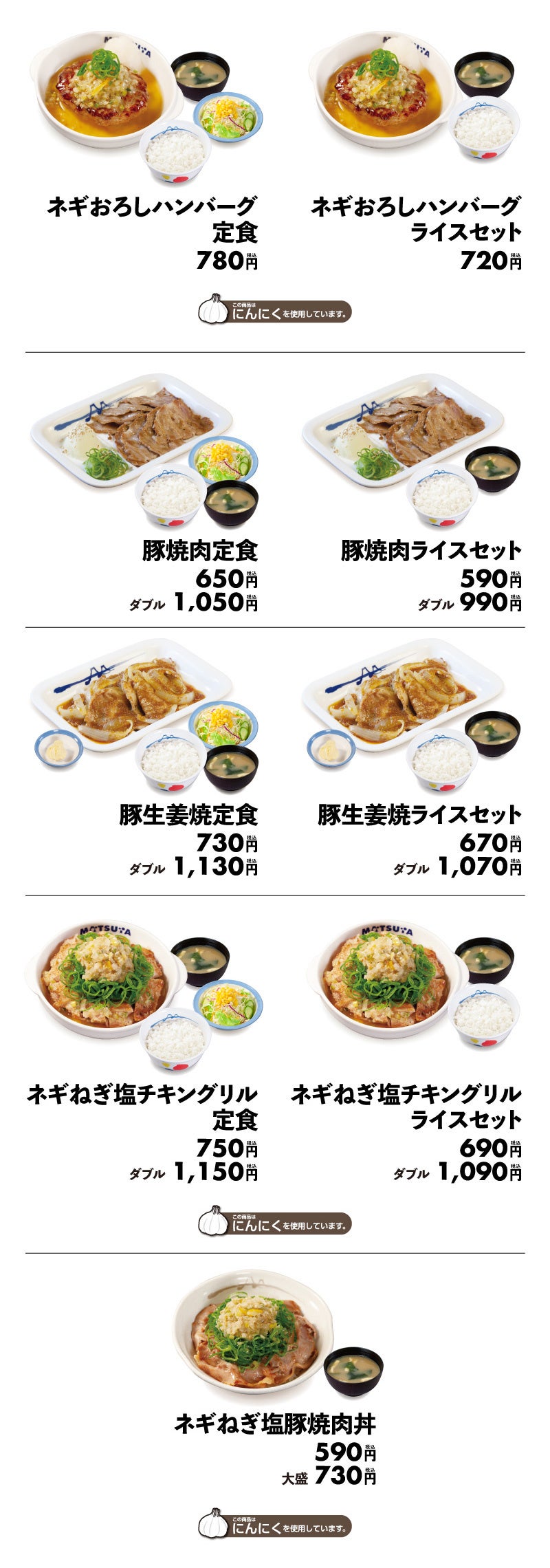 | 商品名 ネギおろしハンバーグ定食 780円 ネギおろしハンバーグライスセット 720円 豚焼肉定食 650円/(W)1,050円 豚焼肉ライスセット 590円/(W)990円 豚生姜焼定食 730円/(W)1,130円 豚生姜焼ライスセット 670円/(W)1,070円 ネギねぎ塩チキングリル定食 750円/(W)1,150円 ネギねぎ塩チキングリルライスセット 690円/(W)1,090円 ネギねぎ塩豚焼肉丼 590円 /(大盛)730円 ※お持ち帰りいただけます。お持ち帰りにみそ汁は付きません。 お持ち帰りの場合、みそ汁は別途60円でお求めいただけます。 ※全て税込み価格です。また、店内・お持ち帰りの税込価格は同一です。 発売日 2022年8月2日(火)午前10時 ~ 対象店舗 一部店舗を除く全国の松屋 |